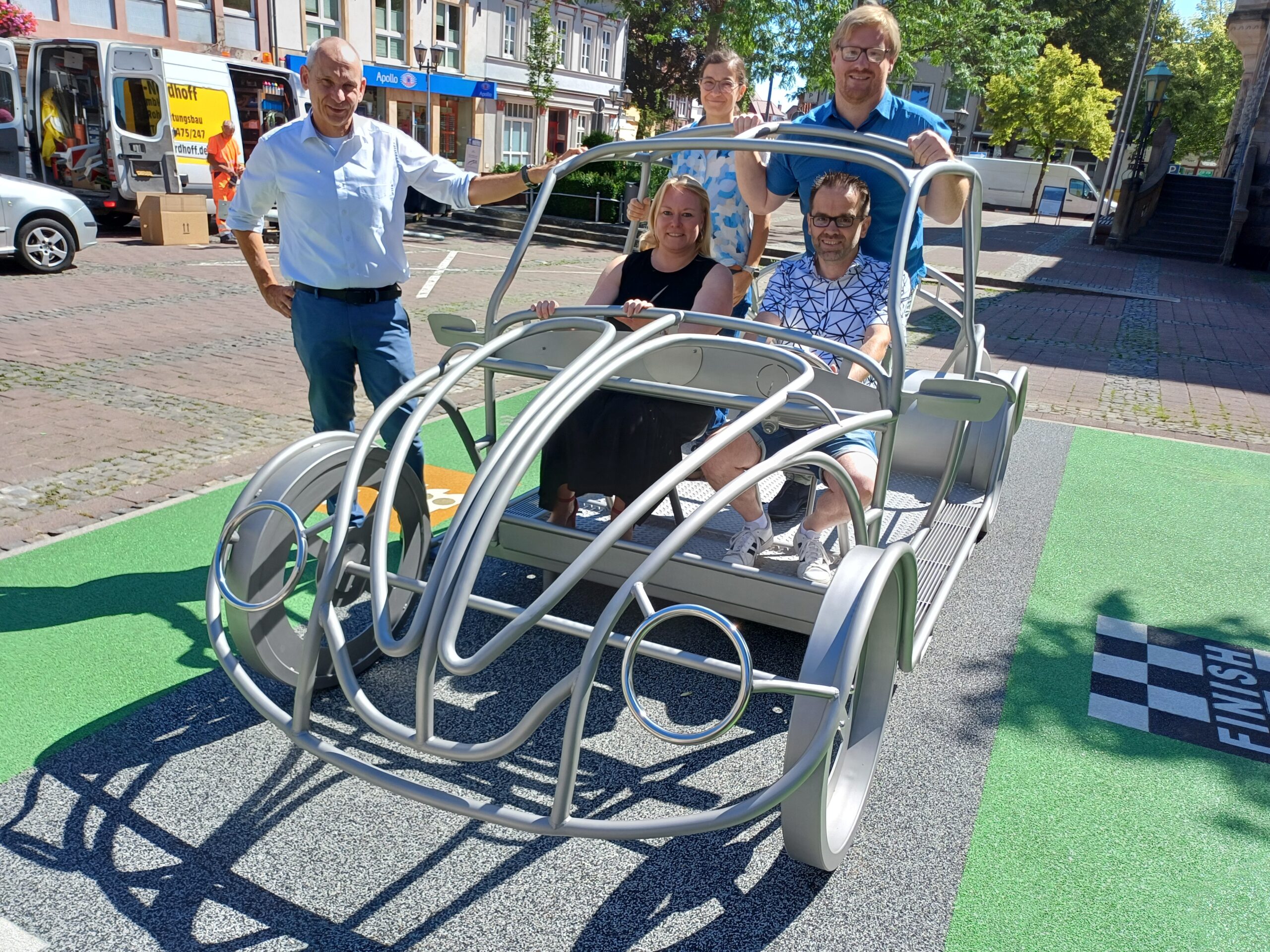 Das Spielgerät steht auf einem stoßdämpfenden Fallschutzbelag, den die Melos GmbH sponserte. Die Aufwertung des Marktplatzes ist Teil eines umfassenden Projekts zur Belebung der Innenstadt – mit neuen Sitzmöbeln, Pflanzkübeln und Denkspielgeräten. Zudem soll das Kletterauto auf das nahegelegene Automuseum aufmerksam machen und so Kultur und Tourismus fördern.