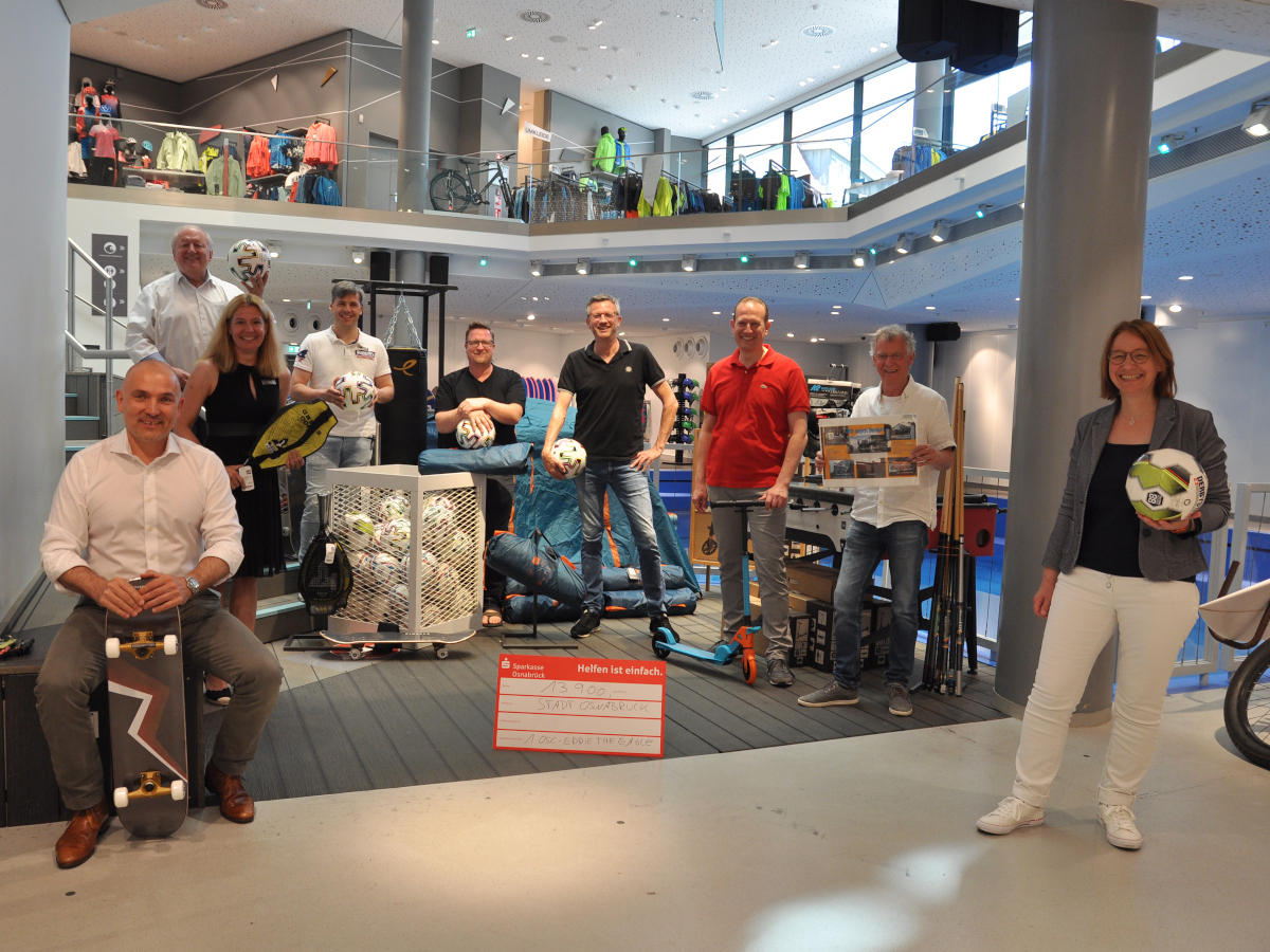 Es ist die größte Spende, die der 1. OSC Eddie the Eagle in den mehr als 4 Jahren seines Vereinslebens übergeben hat – entsprechend offiziell und ein bisschen größer war der Rahmen bei der Übergabe im Sporthaus L&T: Michael de Vries, Peter Band, Christian Grzenkowski, Michael Starke und Gunnar Schwender überreichten Spiel- und Sportgeräte im Gesamtwert von 13.900 Euro an Kerstin Schlüter, die als Leiterin des Jugendamtes Osnabrück, die Spende zusammen mit Martin Niemann als Leiter des Heinz-Fitschen-Haus und die 5 weitere Osnabrücker Jugendzentren Ostbunker, Gemeinschaftszentrum Ziegenbrink, Haus der Jugend, Westwerk und Gemeinschaftszentrum Lerchenstraße entgegennahm.