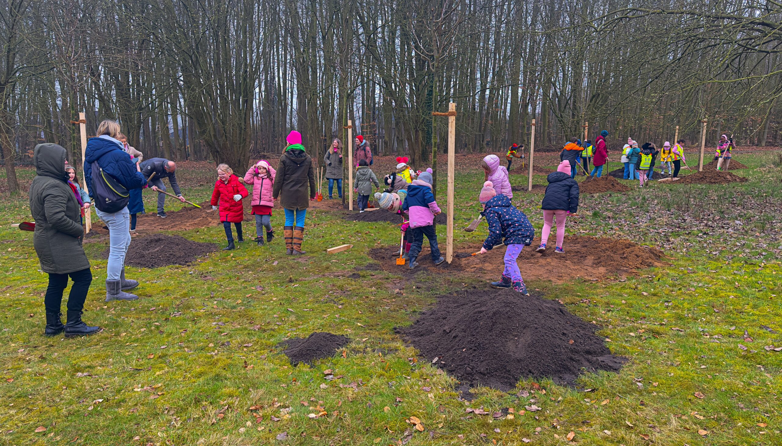 Zum großen Spaß von 48 Kindern der Grundschulen Heiligenweg im Schinkel und Overberg am Schölerberg konnte durch die Spende von 16 Bäumen der OsnaBRÜCKE Kinderwald in Voxtrup in dieser Woche erweitert werden. Zu den bereits gepflanzten Obstbäumen kamen jetzt Eichen, Buchen, Ahorn und Linden hinzu. Die Bäume waren eine Spende aus einem Mitarbeiterevent der Rabe Moden aus Hilter, der Rosengarten Tierbestattung aus Badbergen sowie der Beratungsgesellschaft PKF-WMS. Außerdem gaben die Haarmann Stiftung Umwelt und Natur sowie die Stiftung Osnabrücker Club über die Aktion „1000 neue Bäume für Osnabrück“ erneut Jungpflanzen hinzu. Unter der Mitwirkung von Alfons Apfelbaum mit Frank und seinen Freunden waren die Grundschüler bei eisigen Temperaturen mit vollem Eifer bei der Sache. Selbst die beteiligten Mitarbeiter der Servicebetriebe Osnabrück staunten über die Geschwindigkeit ihrer jungen Helfer. Nach nur 1 ½ Stunden war der letzte Spatenstich getan und alle mit ihrer Arbeit sehr zufrieden.