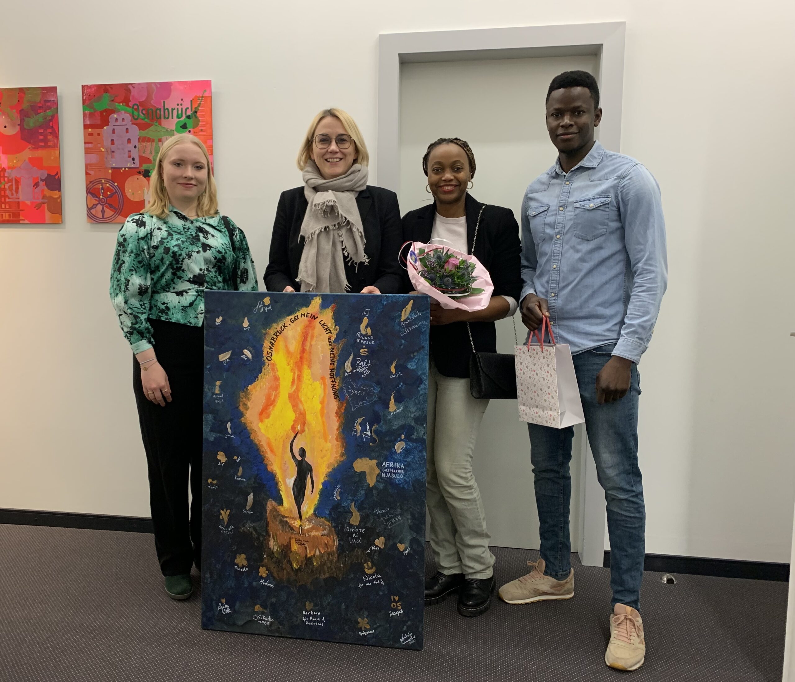 Der Verein „Zusammen Bewegen e. V.“ nahm beim Benefizkonzert im Haus der Jugend in Osnabrück mehr als 4.000 Euro ein, um ein Internat in Kamerun zu bauen. Jetzt übergaben sie zum Dank ein gestaltetes Gemälde an Oberbürgermeisterin Katharina Pötter.