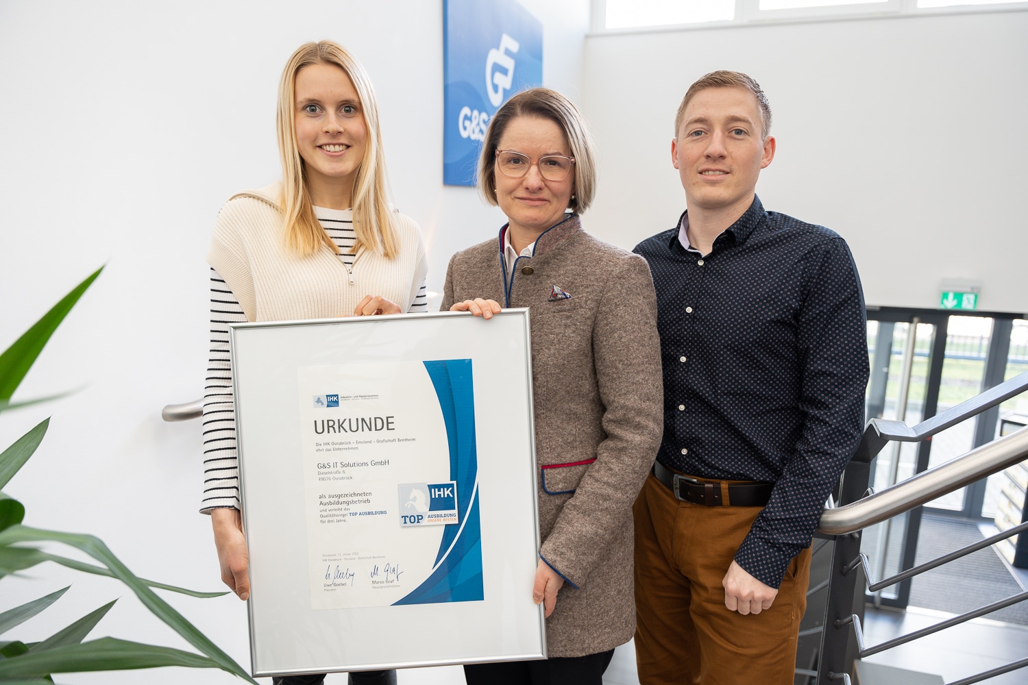 Das Unternehmen G&S IT Group wurde für exzellente Ausbildungsmöglichkeiten ausgezeichnet. Das Qualitätssiegel der Industrie- und Handelskammer Osnabrück – Emsland – Grafschaft Bentheim unterstreicht einen hohen Stellenwert der Ausbildung junger Menschen und motiviert zur Weiterentwicklung.