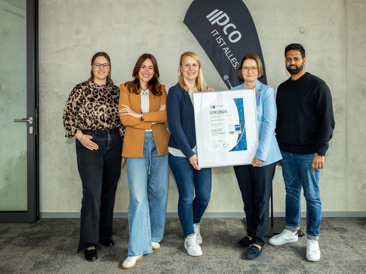„Wir freuen uns sehr, dass wir die Auditoren erneut von unserem Ausbildungskonzept überzeugen konnten. Das Zertifikat bestätigt, dass wir ein ‚ausgezeichneter‘ Ausbildungsbetrieb sind, und das wirkt sich insgesamt positiv auf die Ausbildung in der IT-Branche aus“, betont Jessica Werries, Leiterin der Personalabteilung. Gemeinsam mit Laura Bröcker, Personalabteilung mit dem Schwerpunkt Recruiting und Lernen und Leynen Vincent Jeyaras, Technik und Ausbildung, nahm sie die Urkunde „TOP Ausbildung“ von Juliane Hünefeld-Linkermann, IHK-Geschäftsbereichsleiterin Aus- und Weiterbildung, entgegen.