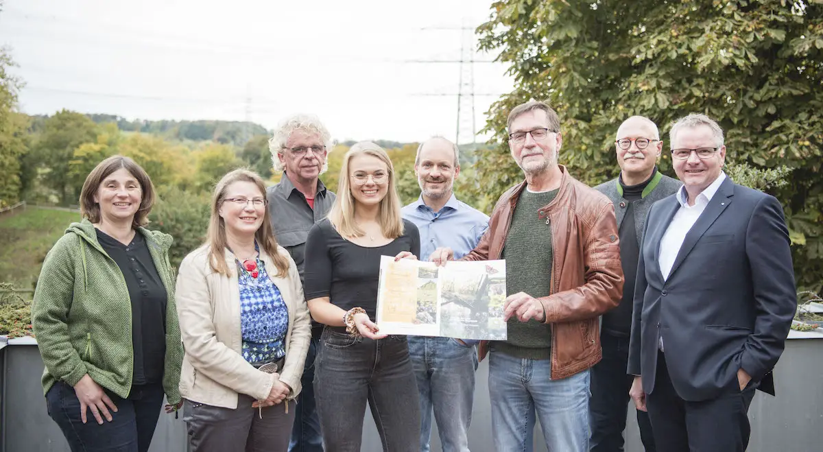 Bildunterschrift: Samantha Quaas (vierte von links) hat den Förderpreis der Naturschutzstiftung für ihre Masterarbeit erhalten. Mit ihr freuen sich (von links) Kuratorin Silke Meier, Bärbel Echelmeyer (Geschäftsführung Naturschutzstiftung), Wolfgang Rötker (Planungsbüro Rötker), Andreas Lechner (Hochschule Osnabrück), Kurator Jürgen Lindemann, Joachim Härtling (Hochschule Osnabrück) sowie Winfried Wilkens (Geschäftsführung Naturschutzstiftung). / Foto: Naturschutzstiftung/Uwe Lewandowski
