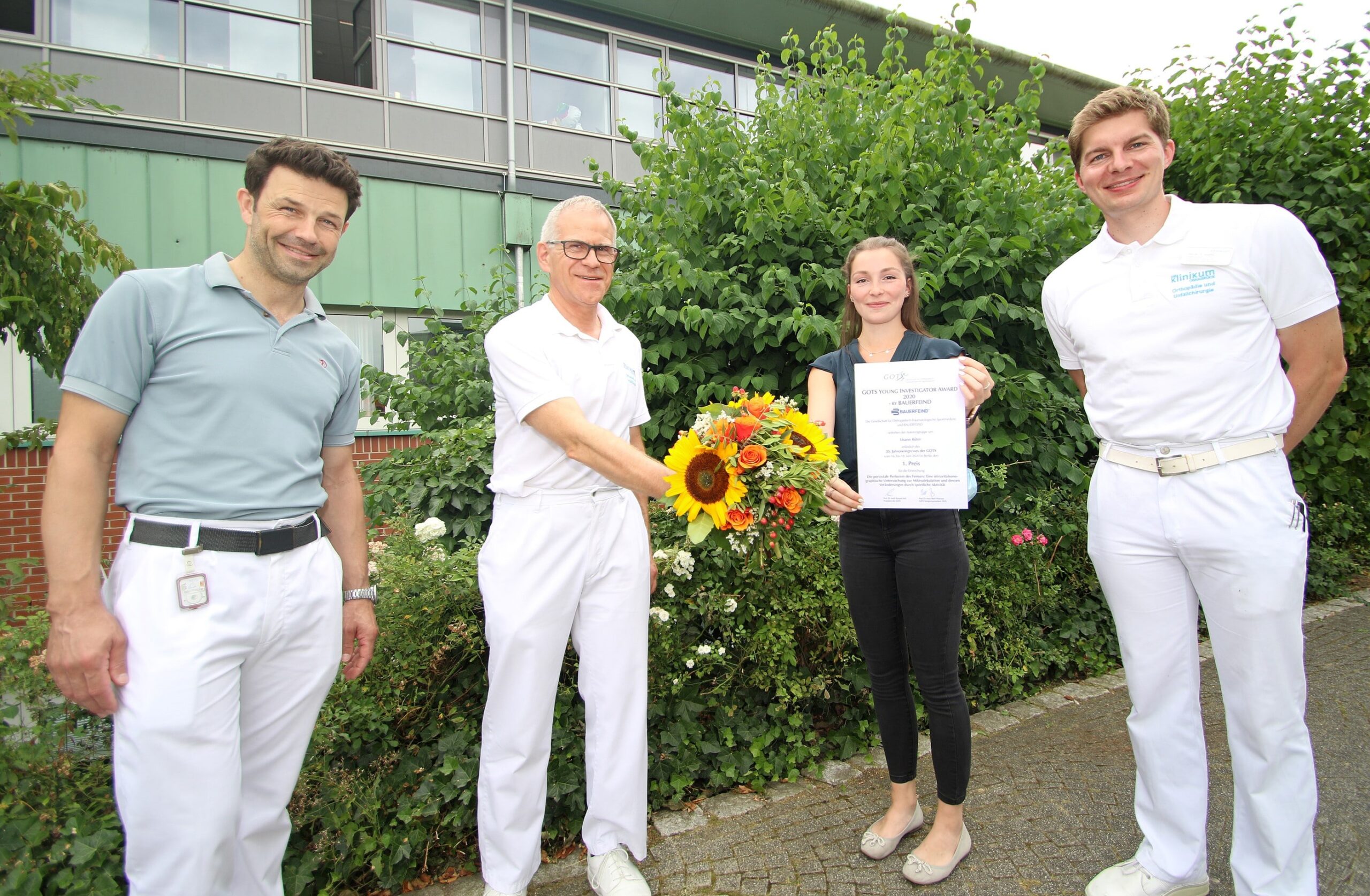 Gut gelaunt: Dr. Casper Grim (l.), Prof. Dr. Martin Engelhardt und Dr. Thilo Hotfliel (r.) gratulierten Lisann Rüter zu dem Wettbewerbserfolg.
