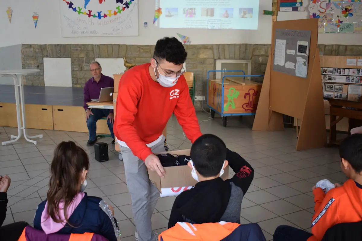 Am Freitagmorgen (2. Oktober) übergab Öztürk Schulleiter Martin Igelmann die Kiste mit den Masken und erzählte den Kindern einer dritten Klasse, wie es zu der Spende kam: „Ich war im Sommer im Urlaub und bin durch einige Länder gefahren, in denen es den Menschen nicht so gut geht wie in Deutschland. In den Schulen dort gibt es nur kleine Klassenräume, in denen die Kinder nicht gut lernen können und auch das Geld für Coronamasken fehlt. Ich habe gesehen, wie gut wir es hier haben und da ich früher selbst auf die Stüveschule ging, möchte ich etwas zurück geben.“ Anschließend erzählte der 24-Jährige von seiner eigenen Schulzeit und beantwortete die Fragen der Kinder. Die Drittklässler wollten unter anderem wissen, ob die Masken selbst genäht seien, ob es zu Öztürks Schulzeit schon iPhones gab und welche Sprachen er beherrsche.