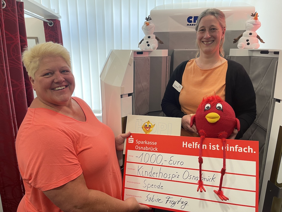 Versteigert wurden Preise, die von Freunden und Kunden gesponsert wurden. Darunter waren etwa zehn Karte für die Eis-Sauna in der hauseigenen Praxis oder ein digitales Radio vom Tonartstudio. Insgesamt kam dort ein dreistelliger Betrag zusammen, den die Inhaberin auf 1.000 Euro aufrundete. Im Kinderhospiz Osnabrück war die Freude über den Spendencheck groß. Mit dem Geld werden Fortbildungen für ehrenamtliche Eltern finanziert.