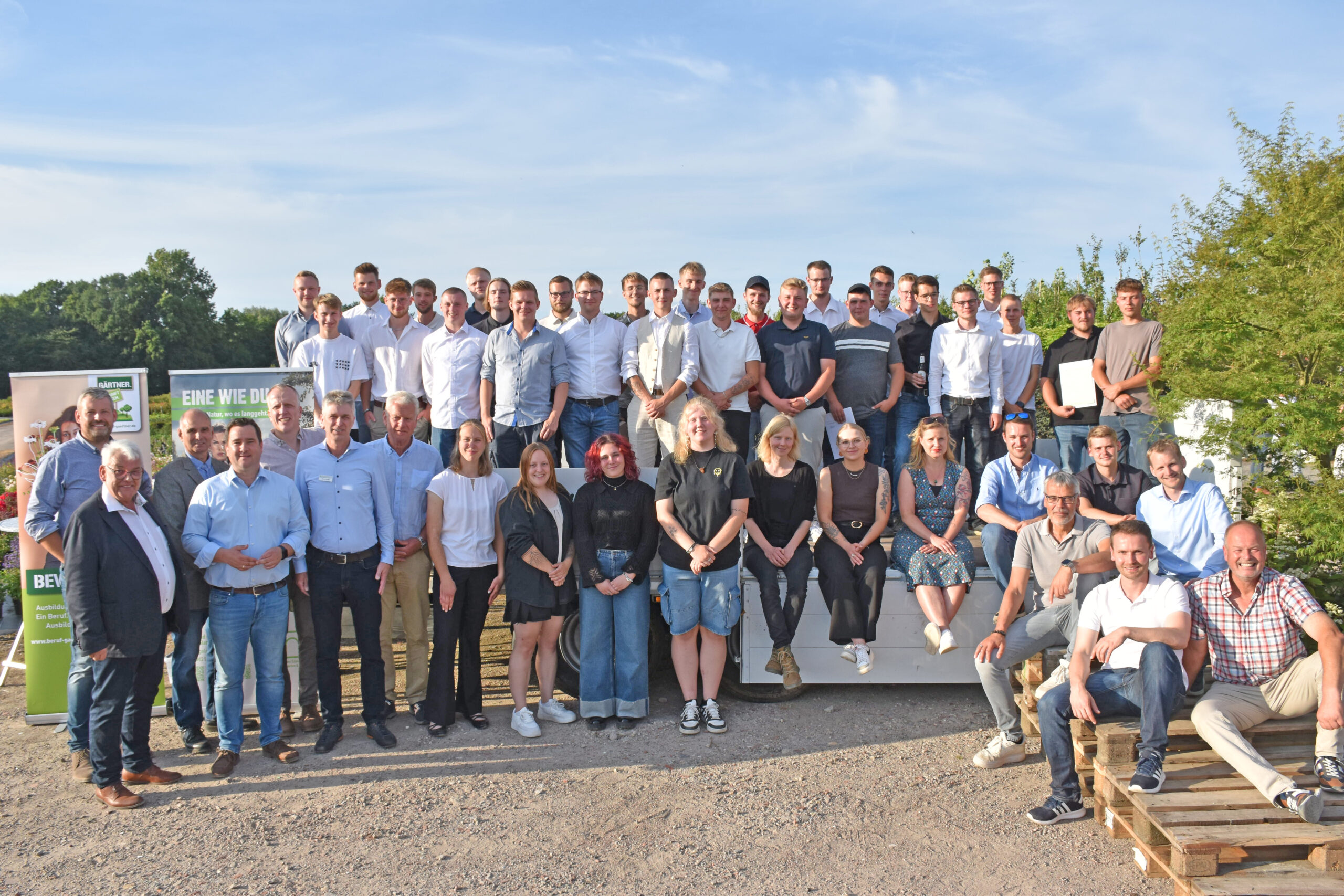 48 Auszubildende legten im Jahr 2025 direkt vor den Sommerferien im Bereich des Berufsschulstandortes Osnabrück ihre Prüfung im Beruf Gärtner/in ab. Zusammen mit 16 erfolgreichen Prüflingen aus der Winterprüfung waren sie eingeladen, ihren Berufsabschluss zu feiern. Gastgeber der traditionellen „Freisprechungsfeier“ war in diesem Jahr das Unternehmen Bentrup GmbH & CO. KG (Baumschulen und Pflanzenhandel) in Bad Iburg, das in diesem Jahr auch sein 100-jähriges Bestehen feiert.