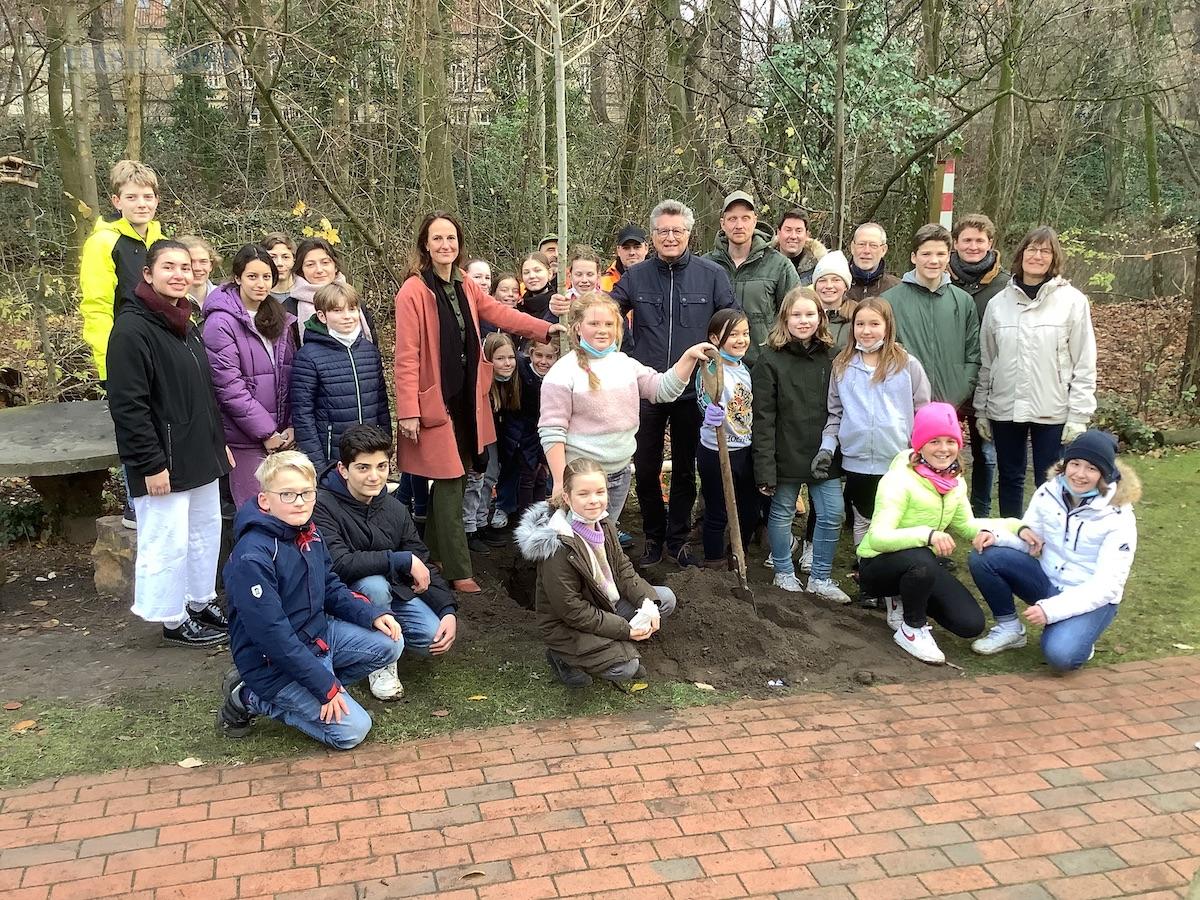 Fritz Brickwedde, Vorsitzender der Stiftung Osnabrücker Club, und Schulleiterin Daniela Boßmeyer-Hoffmann umringt von an der Baumpflanzaktion beteiligten Schülerinnen, Schülern und Lehrkräften. / Foto: Ursulaschule Osnabrück