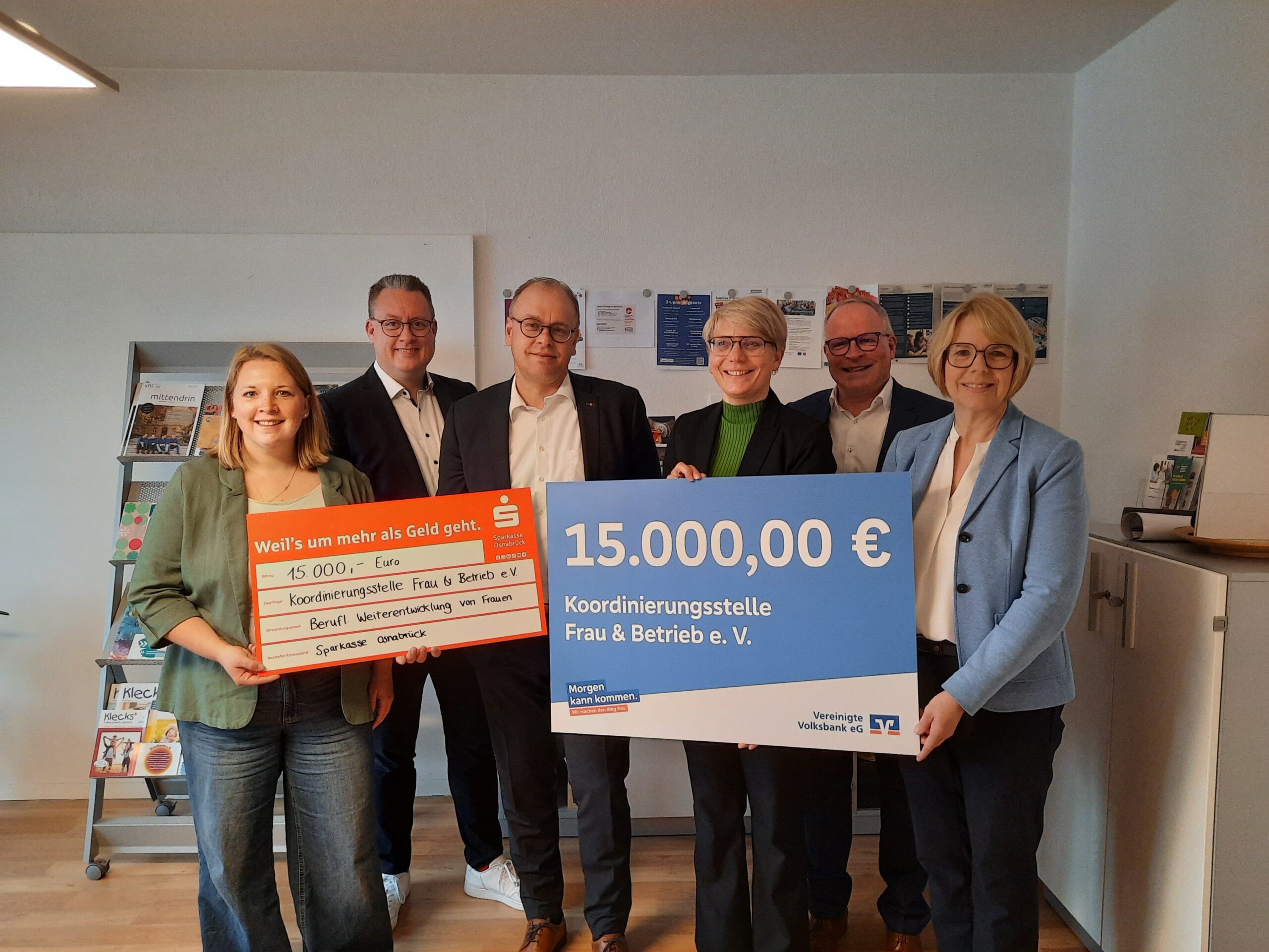 Die Vereinigte Volksbank und die Stiftung der Sparkasse Osnabrück fördern die Koordinierungsstelle Frau und Betrieb in Osnabrück mit je 15.000 Euro. Die Spendenübergabe fand am Montag (14. April) statt.