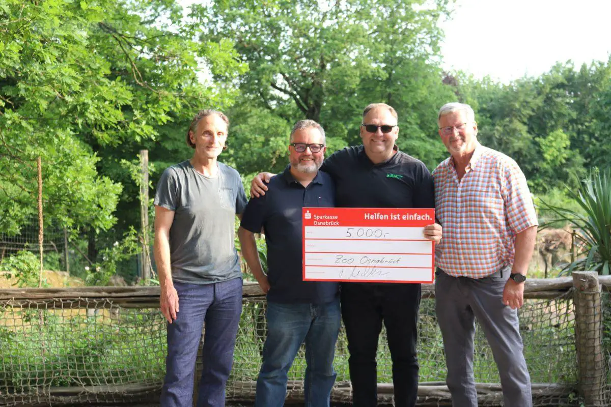 Weitere 5.000 Euro hat die „Testzentrum Zoo UG“ an den Zoo Osnabrück übergeben. Insgesamt hat das Testzentrum damit bereits 30.000 Euro an den Zoo Osnabrück gespendet. Jens Schaffhäuser (Geschäftsführer „Testzentrum Zoo UG“), Heiko Pohlmann (Gesellschafter „Testzentrum Zoo UG“), Michael Wend (Schatzmeister der Zoogesellschaft Osnabrück e.V.) und Joachim Fiedler (Geschäftsführer „Testzentrum Zoo UG“) / Foto: Lisa Simon, Zoo Osnabrück