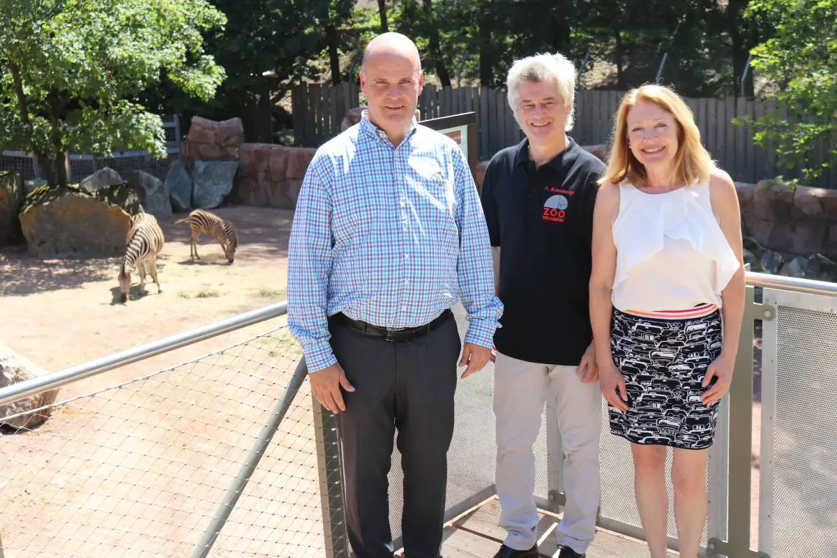 „Der Zeitpunkt, zu dem wir uns für die Hauptpartnerschaft entschieden, fiel zusammen mit der Geburt von ‚Franz das Zebra‘ – da beschlossen wir kurzfristig, auch noch die Patenschaft für das Fohlen zu übernehmen“, freut sich Philipps. Franz das Zebra ist seit über 20 Jahren das erste Zebrajungtier am Schölerberg und damit für den Zoo und seine Besucher etwas Besonderes. Beim Besuch des Patentieres konnte André Philipps die Zebras vom neuen Steg der umgebauten Nashornanlage aus beobachten. Franz das Zebra lebt mit seinen Eltern Jule und Django, den Breitmaulnashörnern Lia, Amali und Miguel sowie den beiden Pinselohrschweinen Hanni und Nanni zusammen.