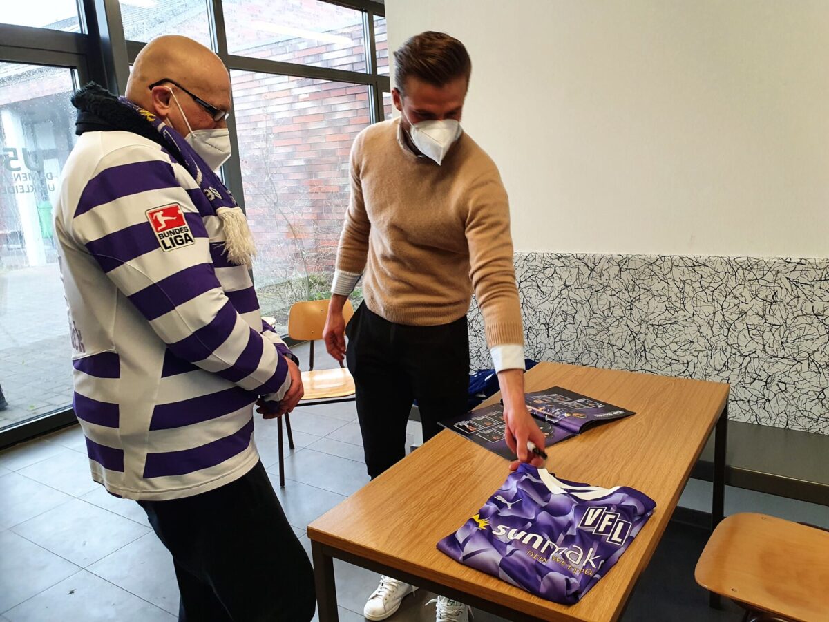 Einmal in der Woche muss „Kalle“ zur Chemo. Die Therapie macht ihn unendlich kraftlos, laugt ihn aus. Das Einzige, das ihn von Schmerzen, Ängsten und Unwohlsein ablenkt und ihn die schwere Krebserkrankung wenigstens für einige Momente vergessen lässt, ist der Gedanke an „seine“ Mannschaft, den VfL Osnabrück. Seit seinem zwölften Lebensjahr ist der heute 65-Jährige großer Fan, war früher sogar als Ordner in der „Bremer Brücke“ dabei. Susanne Lange vom Hospizverein Bramsche, die „Kalle“ gemeinsam mit ihrer Kollegin Heike Klein betreut, weiß von der großen Passion ihres Patienten. Sie hat sich an den Wünschewagen vom ASB-Niedersachsen e.V. gewandt, gemeinsam mit den Samaritern für Karl-Heinz Stolzenberg einen ganz großen Herzenswunsch in Erfüllung gehen lassen: ein Besuch beim Training des Zweitligisten und ein anschließendes Coronakonformes Treffen mit dem Team und vor allem mit Kalles Lieblingskicker, dem Stürmer Christian Santos.