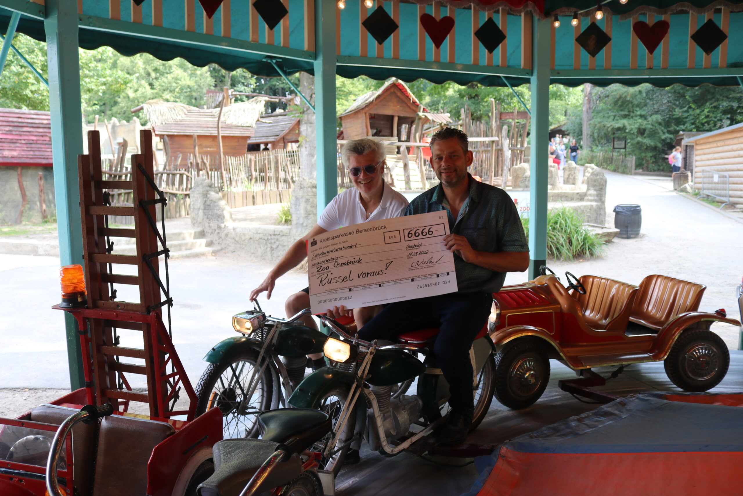 Mit Karussellfahren die Osnabrücker Elefanten unterstützen: Dank des Karussells, das am Affentempel im Zoo Osnabrück regelmäßig zum Fahren einlädt, kamen 6.666 Euro zusammen. Wieland Events spendet die Summe an die Spendenkampagne „Rüssel voraus!“. Das Karussell soll nun dauerhaft das Angebot des Zoos ergänzen.