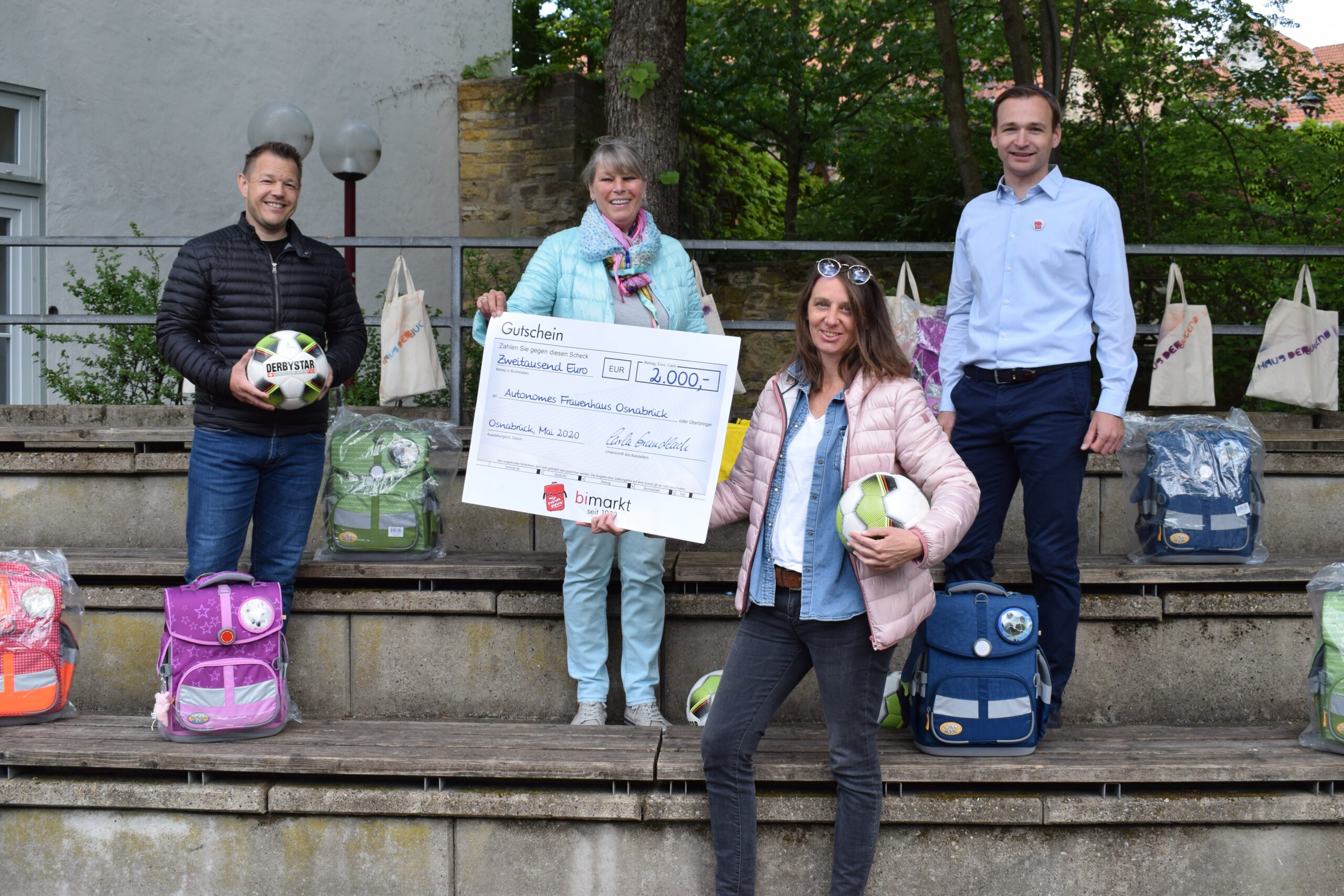 Um ihnen bei der Finanzierung des Schulalltags zu helfen, spendete Wir starten gleich! ein großes Unterstützungspaket an das Frauenhaus. Neben zehn Schulranzen, bi-markt sowie Bücher Wenner Gutscheinen im Wert von 2.000 beziehungsweise 1.500 Euro durften Fußbälle und Trikots zum Dribbeln nicht fehlen. Sie wurden vom ehemaligen deutschen Fußballspieler Thomas Reichenberger beigesteuert: „Es ist wichtig, dass wir nicht nur viel erzählen, sondern auch handeln. Und hier sehen wir direkt, wo die Spenden ankommen.“ Auch das Osnabrücker Traditionshaus Schäffer beteiligte sich mit einem 250 Euro Gutschein an dem großen Spendenpaket. Initiiert wurde die Aktion von Fabian Voges, Geschäftsführer von Wir starten gleich!. „Wir wollen Frauen, die nach der Ankunft im Frauenhaus viele Sorgen haben, etwas entlasten und ein positives Signal senden“, erzählt der Geschäftsführer. Seine Mutter Sonja Gering-Höfelmeyer schließt sich an: „Wenn wir alle etwas an unsere Nächsten denken, haben wir schon viel geschafft.“ Die Gutscheine sind gestückelt, damit das Frauenhaus gezielt seine Bewohnerinnen und ihre Kinder unterstützen kann.