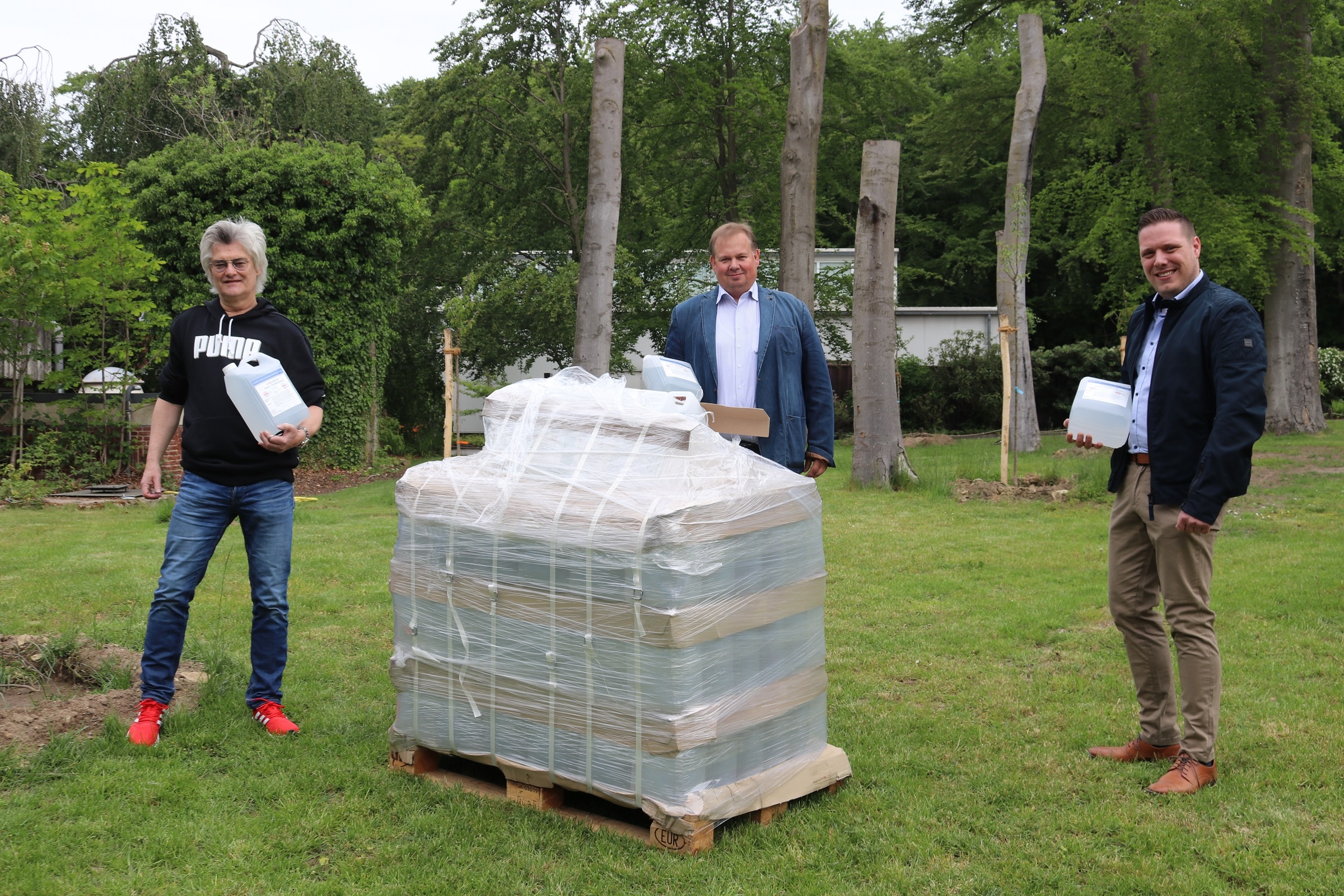 Zoogeschäftsführer Andreas Busemann freut sich über die großzügige Spende von 2.400 Litern Desinfektionsmittel, die Guido Blum, Geschäftsführender Gesellschafter und Florian Schwentker, Prokurist und Vertriebsleiter der Firma German-Oecotec überreichten. / Foto: Zoo Osnabrück, Marilena Koch.