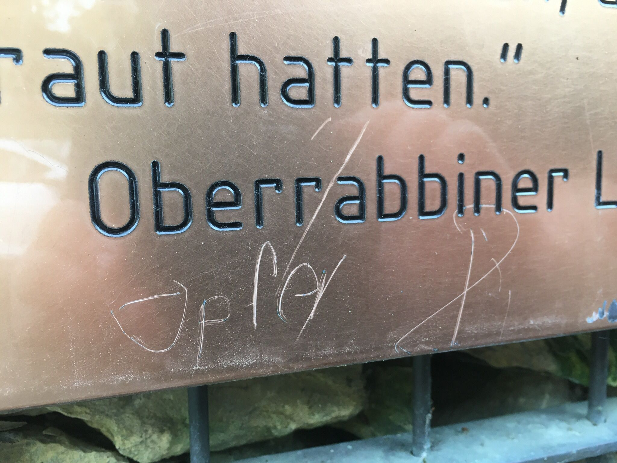Unsere Redaktion wurde von einer Leserin auf die Kratzspuren aufmerksam gemacht. Das Hakenkreuz ist inzwischen wieder von Dritten weggekratzt worden, es lässt sich aber bei genauerem Hinsehen noch erkennen. Zusätzlich wurde auf einer der vier Tafeln das Wort „Opfer“ unter das Wort „Oberrabiner“ gekratzt.