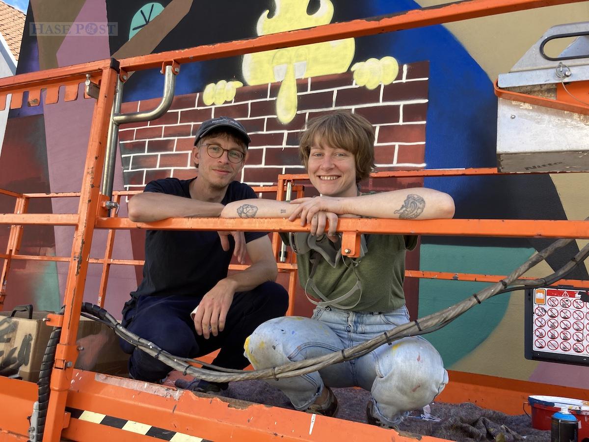 Seit Montag (29. August) arbeiten Danika Arndt und Benjamin Stemmer alias Arndt & Grumbowski an einer Hauswand in der Osnabrücker Altstadt. Das Künstlerpaar gestaltet regelmäßig gemeinsam Fassaden und hinterließ bereits am Hochbunker seine Spuren. Als sie in diesem Jahr wieder für ein dauerhaftes Gemälde angefragt wurden, war die Freude bei den beiden Hamburgern groß. Für sie sei es eine Ehre, auch der Mühlenstraße ihre Handschrift zu verleihen.