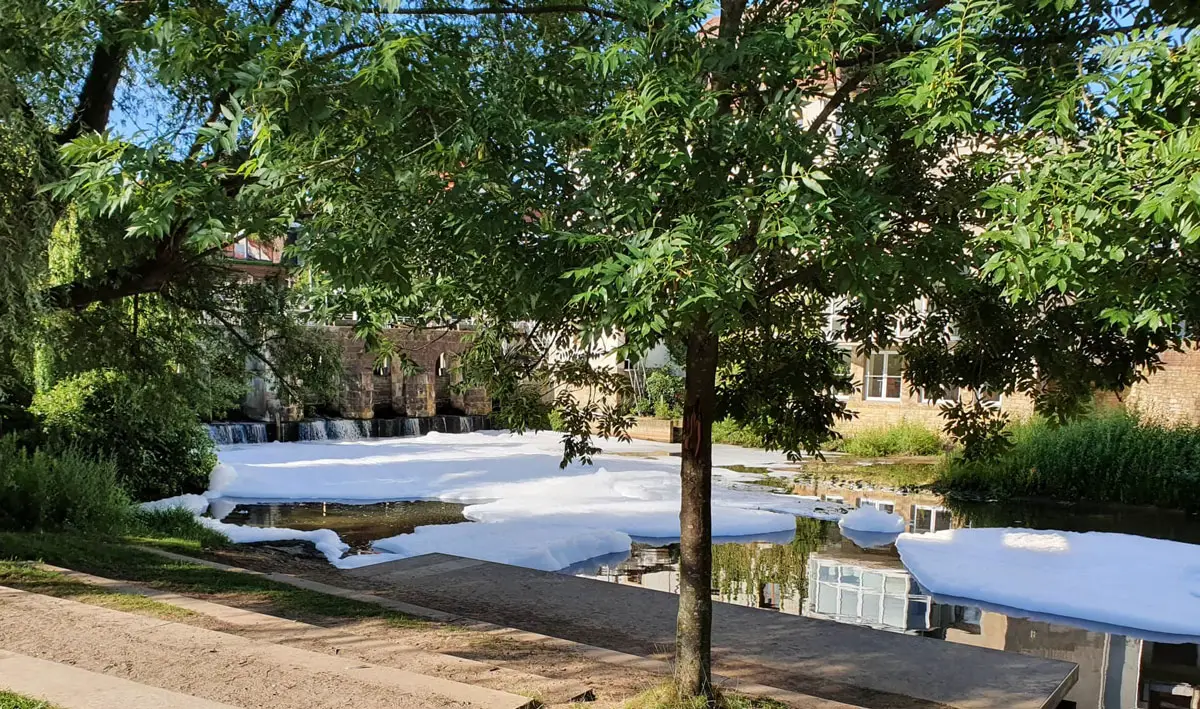Es sieht ein wenig wie Eisschollen, ist bei genauerem Hinsehen aber wohl Löschschaum, der seinen Weg in das Osnabrücker Fließgewässer gefunden hat. Im schlimmsten Fall könnte es sich auch um Chemikalien aus dem Lager der abgebrannten Reinigungsmittelfirma handeln.