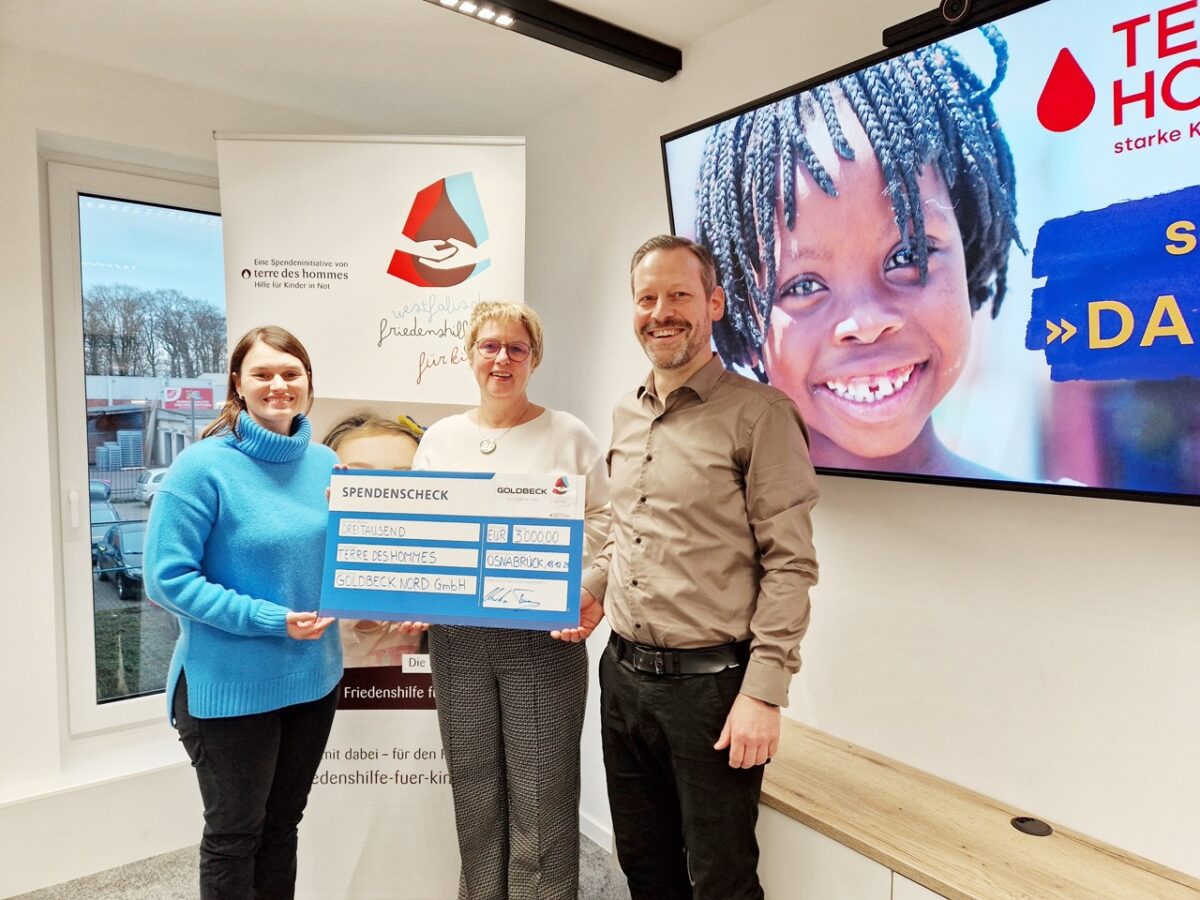 Gutes tun, wo es dringend gebraucht wird: Statt Kundengeschenke zu verteilen, spendet das Bau- und Dienstleistungsunternehmen Goldbeck in diesem Jahr 3.000 Euro an die Initiative Westfälische Friedenshilfe für Kinder. Die Übergabe des Spendenschecks erfolgte am 18. Dezember am Terre des Hommes Standort in Osnabrück, der die Spendeninitiative ins Leben gerufen hat.