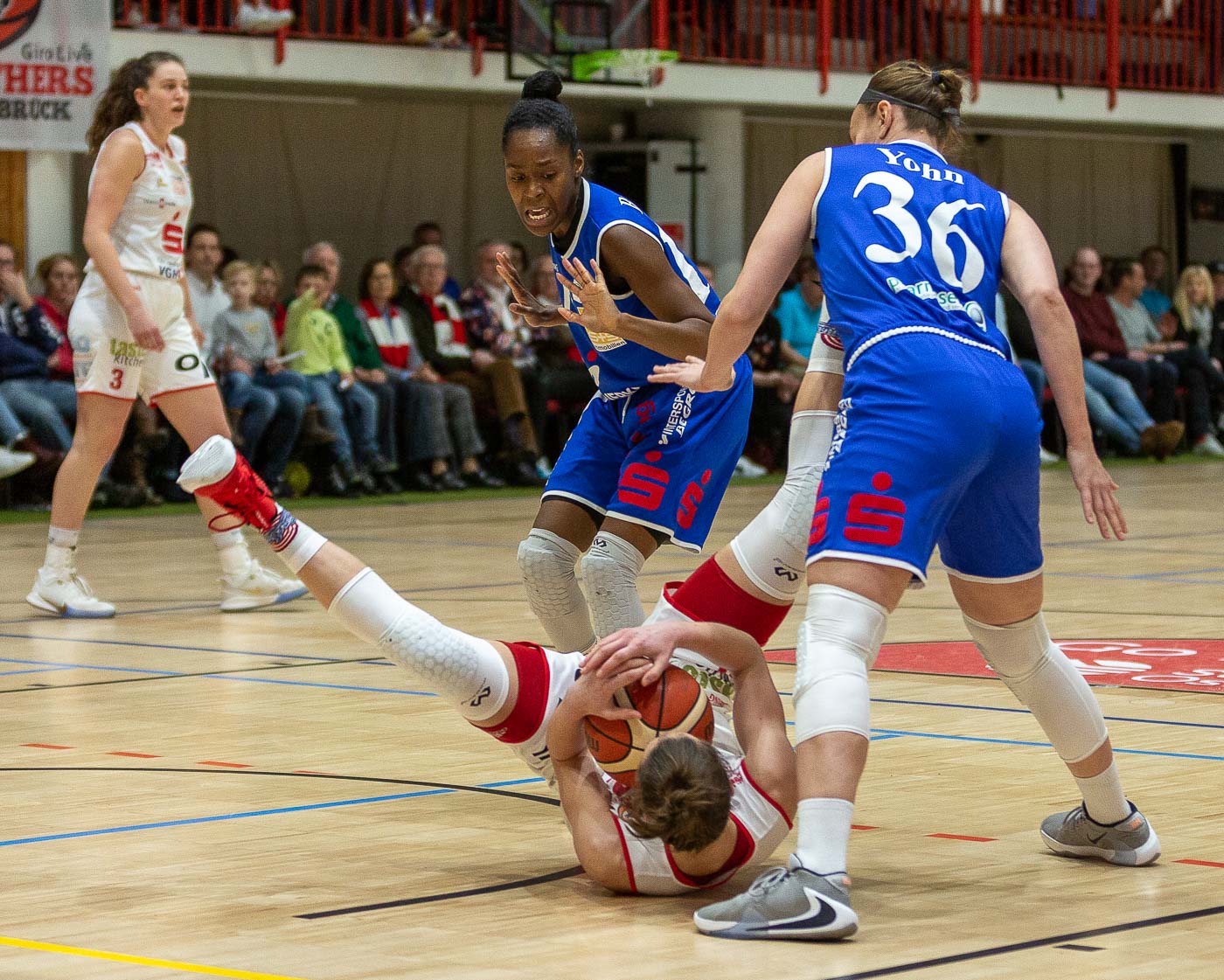 Am Ende des dritten Viertels fuhren die Osnabrückerinnen nochmal richtig zu Höchstleistungen auf und vergrößerten den Abstand zu 62:44 Punkten. Das Spielende fiel daher wie erwartet aus – Die GiroLive-Panthers Osnabrück konnten ihre Gegnerinnen aus Marburg hochverdient mit einem Score von 77 zu 63 besiegen. Damit haben die Osnabrückerinnen den ersten Sieg seit vier Wochen eintüten können, zuvor unterlagen sie gegen die Gegnerinnen aus Keltern, Nördlingen und Freiburg. Die Aufsteiger können jetzt nur noch von den Heidelbergerinnen aus den Playoffrängen verdrängt werden.