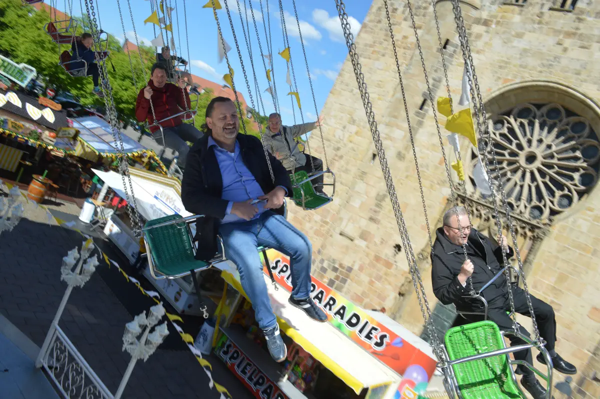 Der Bischof nutzt die Gelegenheit und brach direkt zu einer kurzen Testfahrt auf: „Es war wunderbar. Ich war seit Jahren nicht mehr auf dem Kettenkarussell, obwohl ich es mir immer vorgenommen habe. Heute war die perfekte Gelegenheit“, sagte er im Anschluss. Die Kirche gibt ihr Gelände jedes Jahr nur für zwei Ereignisse frei: Die Maiwoche und den Weihnachtsmarkt, denn Kirche und Kirmes gehören hier eng zusammen.