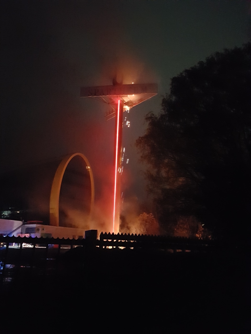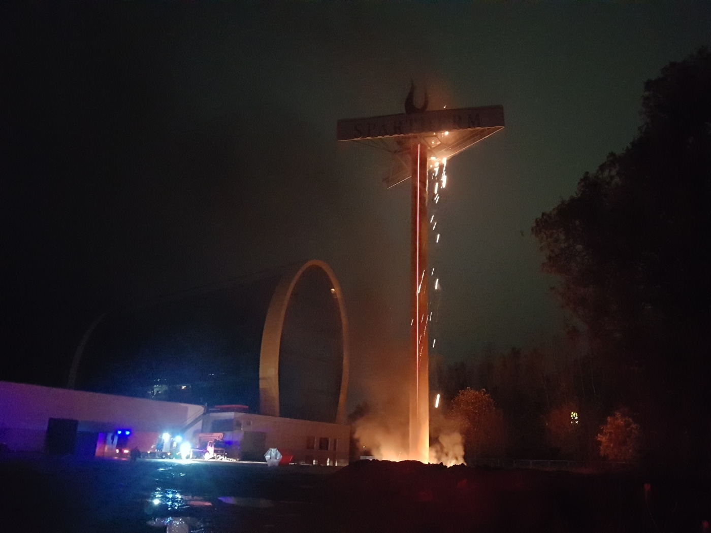 Beim Eintreffen der Einsatzkräfte brannte in der Höhe die beleuchtete Reklame und ebenso herabgefallenes Brandgut am Fuß des Turms.