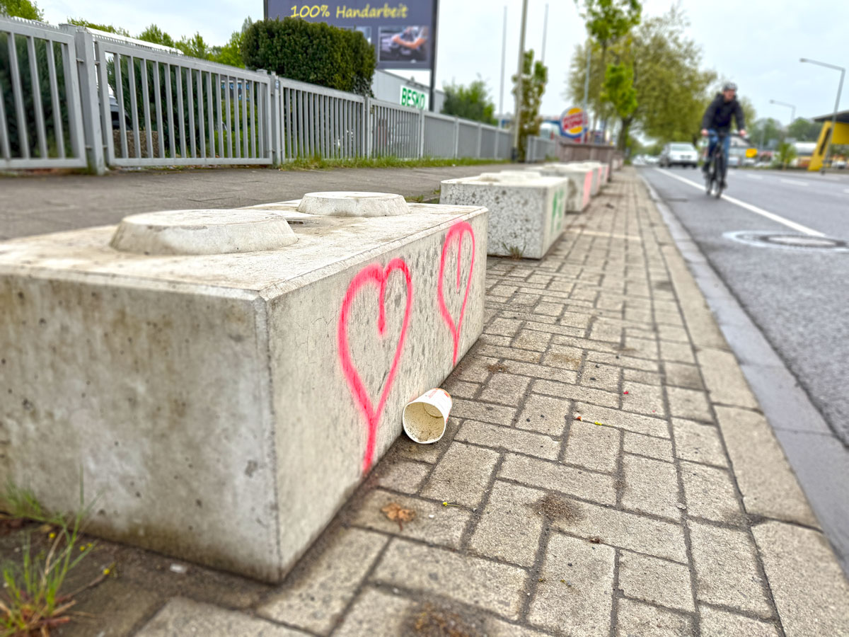 Es muss wohl die ganz große Liebe sein – oder die Liebe zu Betonblöcken? War hier womöglich der ‚legendäre‘ ehemalige Stadtbaurat mit der Sprühdose unterwegs? Vermutlich nicht. Eine Unbekannte oder ein Unbekannter hat rund um das Osterwochenende mehrere Hundert Herzchen auf die Betonpoller an der Pagenstecherstraße (aka „Page“) gesprüht.