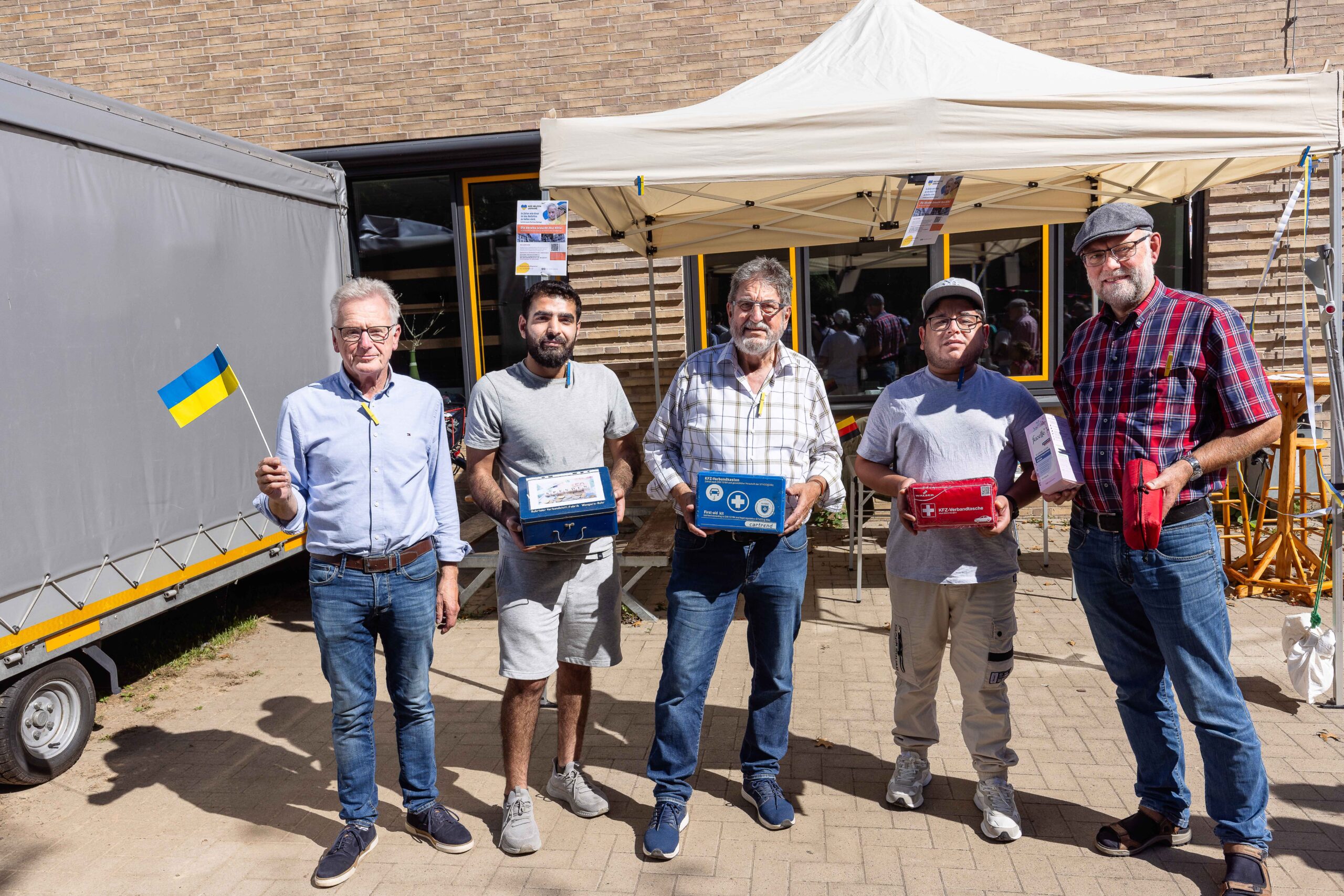 Bildunterschrift zum Titelbild: Josef Strunk (Mitte) und (von links) Ludwig Berg, Omar Abdulrahman, Ottman Mnalaissa und Werner Echtermann sammelten beim Kinderflohmarkt der Grundschule Osnabrück-Hellern Erste-Hilfe-Materialien für die Ukraine. / Foto: Christof Haverkamp