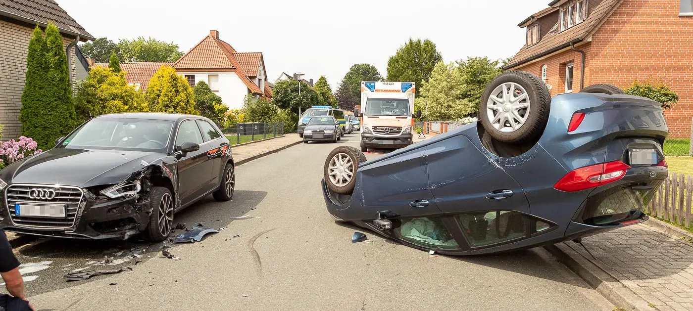 Startseite AktuellIn Tempo 30 Zone: Fahranfängerin (19) legt Auto in Belm auf das Dach