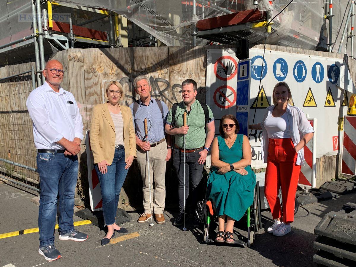 (von links) Rudolf Broer (Geschäftsführer RTB), Oberbürgermeisterin Katharina Pötter, Gerhard Renzel (BVN), Steven Brentrop (Fachkoordinator für Inklusion Stadt Osnabrück), Petra Mathiske (1. Vorsitzende des Behindertenforums Stadt Osnabrück) und Lena Kley (Marketing Managerin bei FABEMA) stehen vor dem neuen Behindertenleitsystem. / Foto: Schweer