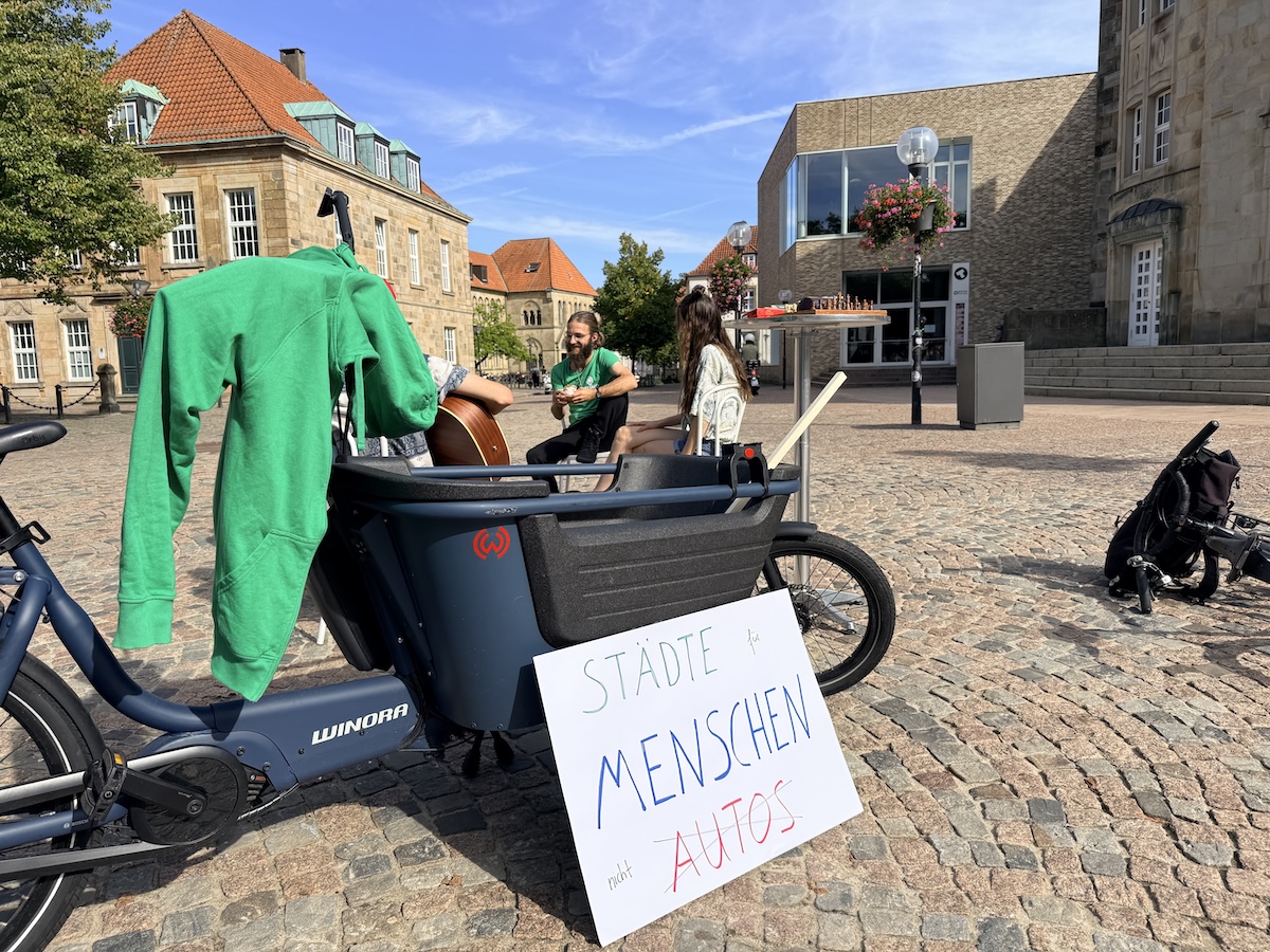 Im Laufe des Tages kamen zahlreiche Passanten und Anwohner ins Gespräch, berichtet Joshua Stock, stellvertretender Vorsitzender des BUND Osnabrück, in einer Pressemitteilung. Diskutiert wurde etwa die Frage, wie viel Raum dem Auto in der Stadt eingeräumt wird – und welche Möglichkeiten entstehen, wenn Flächen für andere Zwecke genutzt werden.