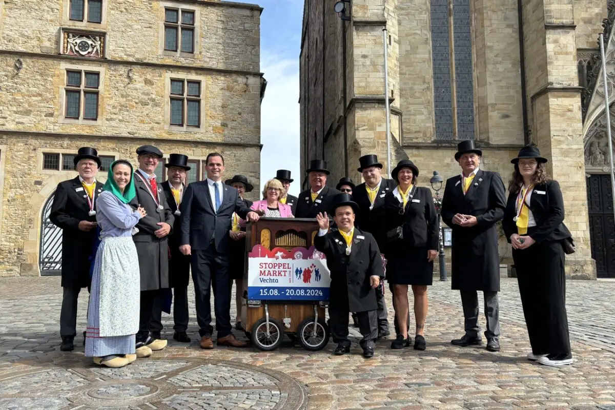 Der Stoppelmarkt in Vechta jährt sich dieses Jahr zum 726. Mal. Um auch in Osnabrück damit zu werben, wurde am Donnerstagvormittag (20. Juni) eine Delegation aus der Stadt im westlichen Niedersachsen im Osnabrücker Rathaus empfangen und warb dort für einen der ältesten Jahrmärkte Deutschlands.