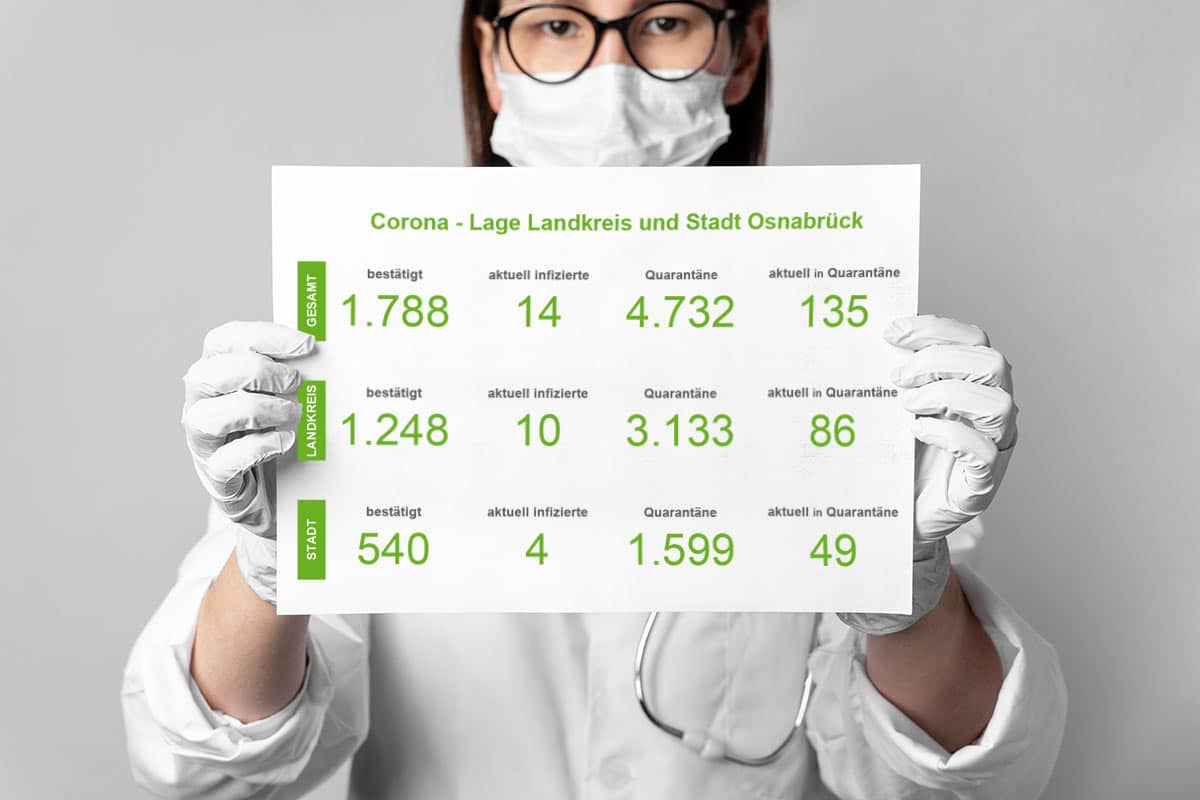 Nach vier neuen Infektionen am Freitag, meldete die gemeinsam für Stadt und Landkreis Osnabrück zuständige Gesundheitsbehörde am Samstag lediglich zwei neue Infektionen innerhalb der vergangenen 24 Stunden. Damit stieg die seit Beginn der Pandemie ermittelte Gesamtzahl für den Landkreis Osnabrück auf 1.248 Infizierte; die Stadt Osnabrück verzeichnet nunmehr 540 Infizierte.