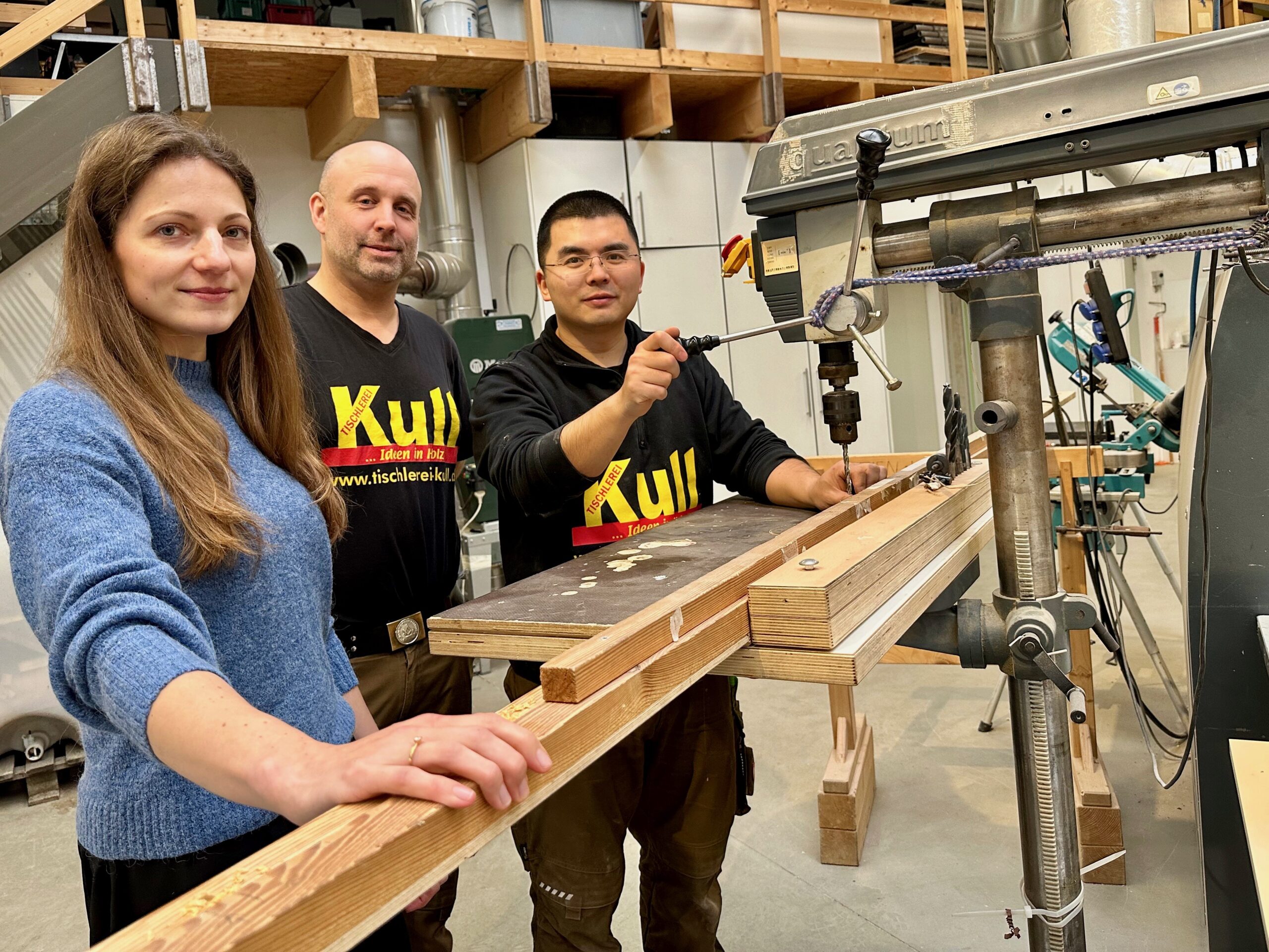 Die Sprachbarriere sei anfangs die größte Hürde gewesen, berichtet Markus Kull. „Als er vor einem halben Jahr nach Deutschland kam, konnte er nur wenig Deutsch. Wir haben uns mithilfe eines digitalen Sprachübersetzers geholfen. Das machen wir noch heute, wenn es schwieriger wird.“ Inzwischen hat sich der 33-Jährige im achtköpfigen Team gut eingewöhnt und unterstützt seine Kollegen bei klassischen Tischlerarbeiten im Betrieb oder auf den Baustellen. „Wir haben ihn gleich mitgenommen auf die Baustellen. Ob der Einbau von Fenstern, Fußbodenlegen oder Möbelbau, Karl ist immer dabei“, erzählt Markus Kull, beeindruckt von dem Mut des Familienvaters. „Chapeau, dass er den Schneid hatte, diesen Schritt zu gehen und alles hinter sich zu lassen. Das macht nicht jeder so einfach.“ Den neuen chinesischen Azubi hat Markus Kull zusätzlich eingestellt. Jährlich startet ein Azubi bei Kull seine Ausbildung. Neben Karl hat im vergangenen Herbst noch eine 18-jährige Frau ihre Ausbildung in der Tischlerei begonnen.