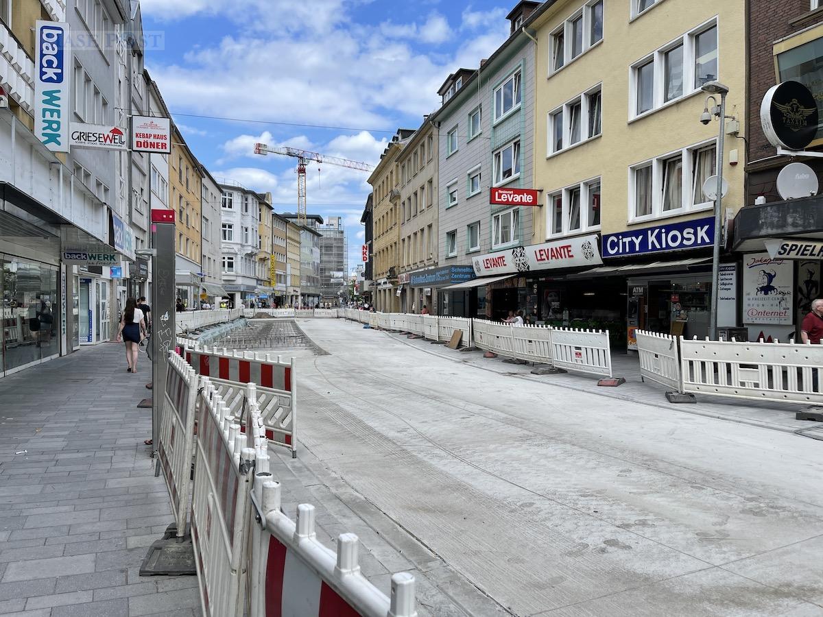 Bald wieder freie Fahrt für den Busverkehr auf der frisch betonierten Johannisstraße. Der Beton wird an der Oberfläche noch geschliffen.. Foto: Pohlmann