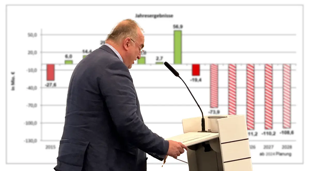 Nach sieben guten Jahren wurde bereits das vergangene Jahr mit einem massiven Defizit von fast 20 Millionen Euro abgeschlossen. Davon ausgehend, über den Zwischenschritt von voraussichtlich -73,9 Millionen Euro in diesem Jahr, wird das Jahr 2025 voraussichtlich mit einem mehr als fünffach so hohen Defizit (-109,2 Mio. Euro) abgeschlossen – und in ähnlich großen Zahlen geht es voraussichtlich auch in den kommenden jahren weiter.
