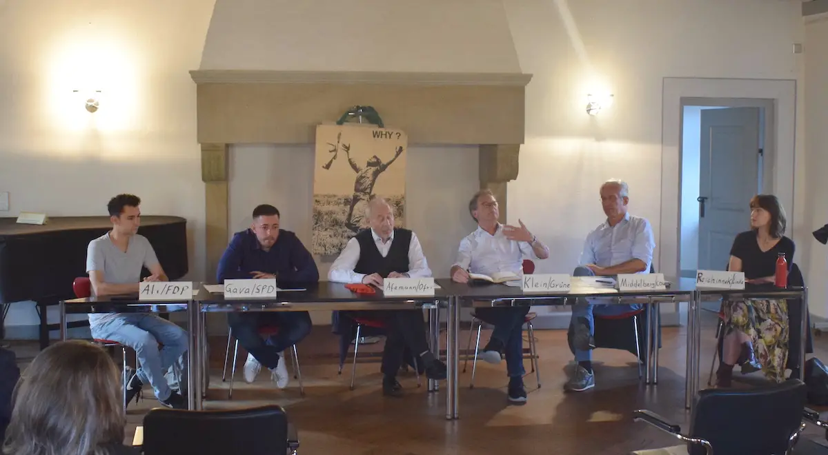 Zu Beginn des Abends stellten sich die Politiker dem Publikum vor und beantworteten eine Reihe zufälliger Fragen. Vor allem die Entsendung der Fregatte Bayern in das Südchinesiche Meer erhitzte die Gemüter. Der 25-jährige Nemir Ali unterstütze den Einsatz: „Es ist eine klare Botschaft gegen das aggressive Gebaren der Volksrepublik China, die immer wieder völkerrechtswidrig Inseln besetzt. Die Mission der Fregatte ist ein deutliches Signal, dass das Meer nicht China gehört und dass wir die Anrainerstaaten unterstützen. Die FDP setzt sich für die Einhaltung internationaler Normen ein, die die Grundlage für den Frieden in der Welt sind.“ Widerspruch kam vor allem vom Grünen Thomas Klein: „Kanonenbootpolitik ist sowas von out. Die Bundeswehr hat defensive und keine offensiven Aufgaben. Die Aggression Chinas ist eine Aufgabe der Weltgerichte, Deutschlands Freiheit wird nicht am Hindukusch und auch nicht im Südchinesischen Meer verteidigt.“