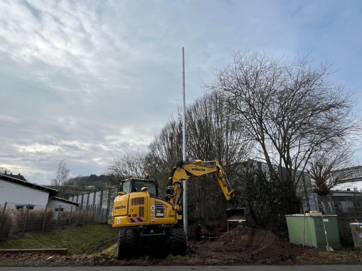 Am Dienstag, 10. Februar, wurde hier die Montage eines 13,5 Meter hohen Stahlmastes durchgeführt, dessen Stromversorgung künftig über ein Solarmodul erfolgen soll. Begonnen wurde am frühen Morgen mit einem hydraulischen Druckplattenversuch, dem die Aushebung einer 2 x 2 Meter großen und 1,50 Meter tiefen Baugrube an der Straße „Gewerbepark“ folgte.