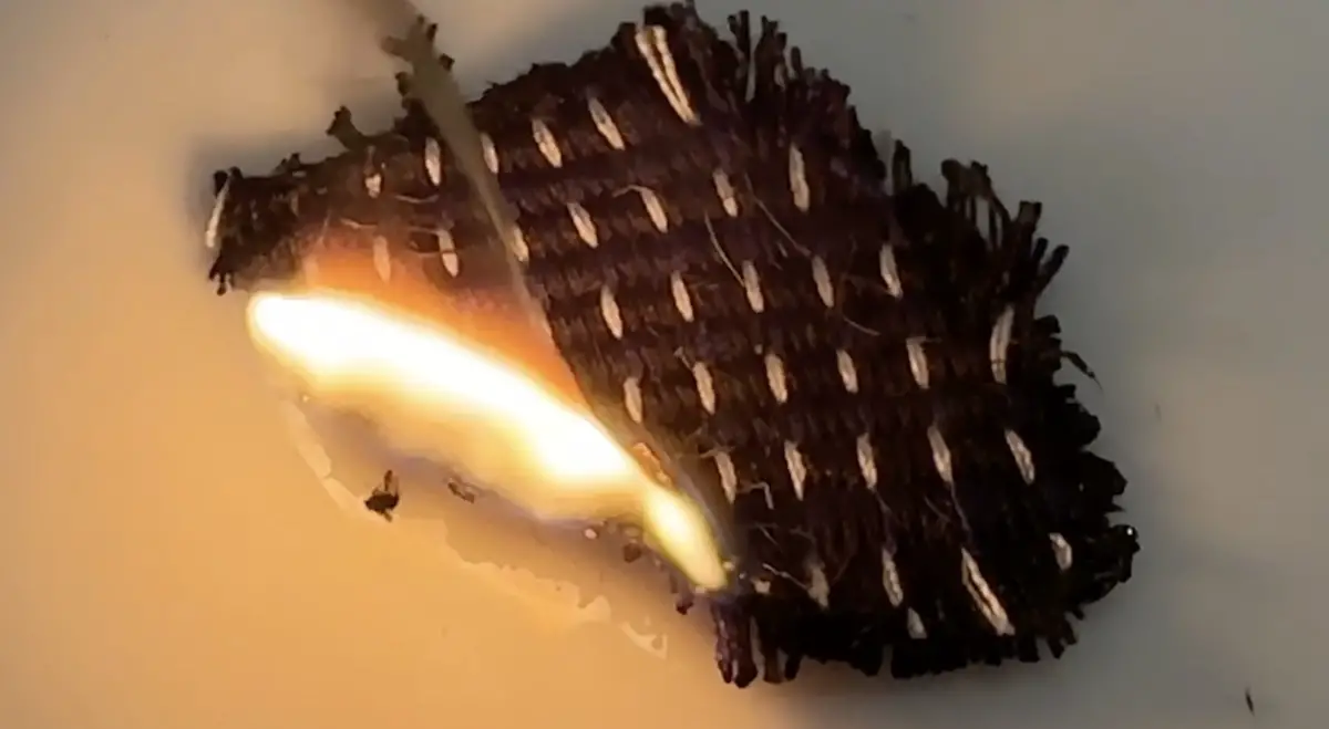 Ein von unserer Redaktion anhand einer Stoffprobe vorgenommener Versuch zeigt, dass das verwendete Material nicht „von selbst erlischt“ und es bei einem Brand wohl auch zu starker Rauchentwicklung kommen dürfte.