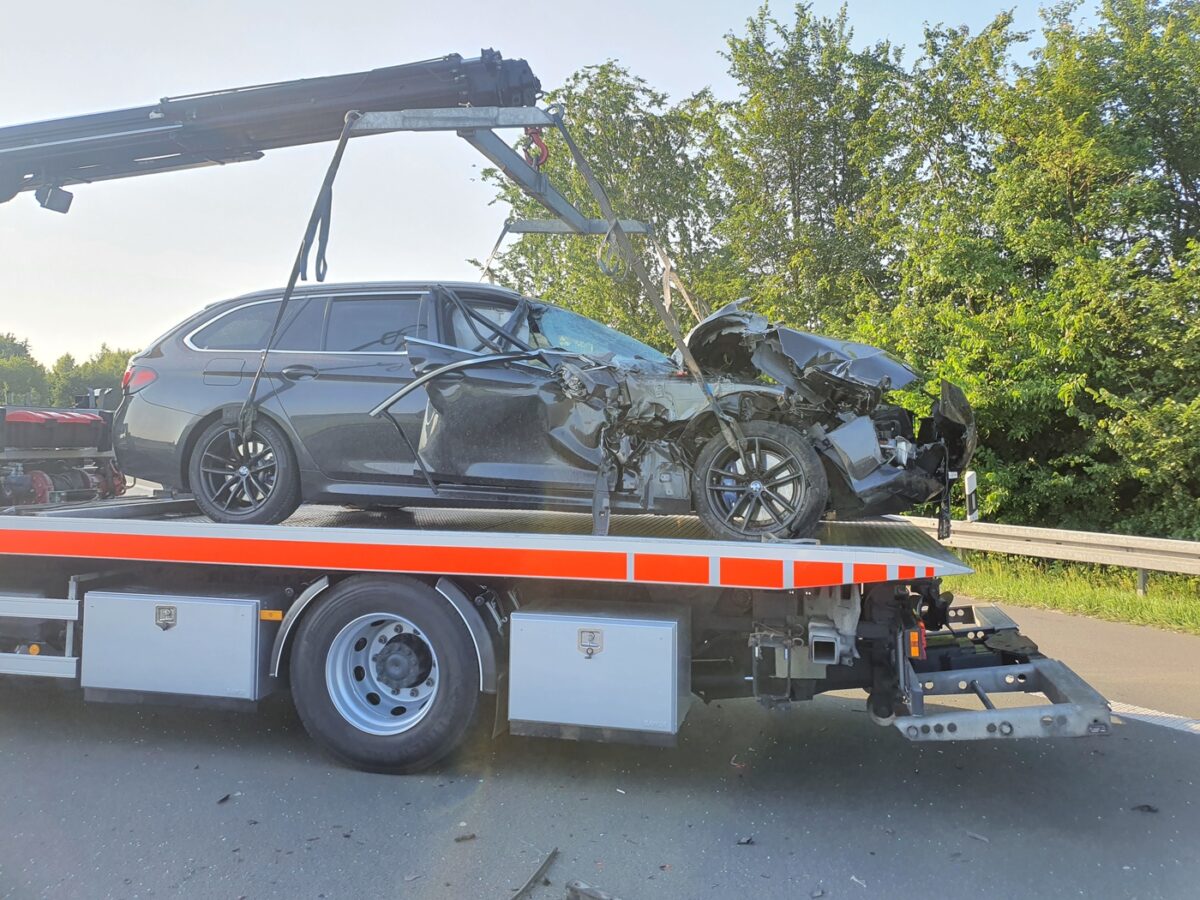 Die Wucht des Aufpralls war erheblich: Die Front des BMW bohrte sich unter das Heck des LKW-Anhängers sowie unter die heruntergelassene Ladebordwand. Der Sattelzug konnte seine Fahrt noch kontrolliert auf den Pannenstreifen fortsetzen und dort zum Stehen kommen. Der BMW hingegen wurde durch die Kollision herumgeschleudert und kam quer zur Fahrtrichtung auf der Überholspur zum Stillstand.