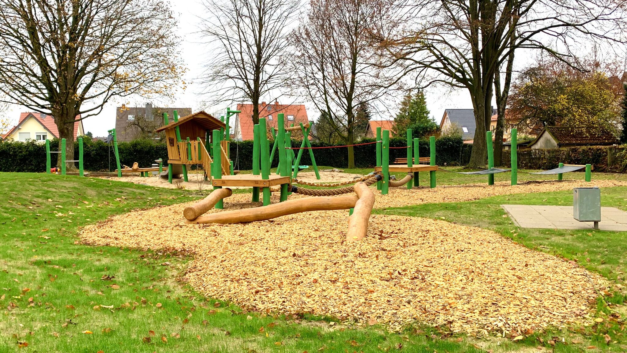 Im Zuge des Gesamtstädtischen Spielplatzkonzeptes in dem alle Spielflächen erfasst und bewertet werden, leiten sich Verbesserungsmaßnahmen ab. Entstanden ist ein Spielplatz, der eingerahmt von einem alten Baumbestand, in natürlicher Holzoptik wieder einheitlich und gepflegt aussieht.