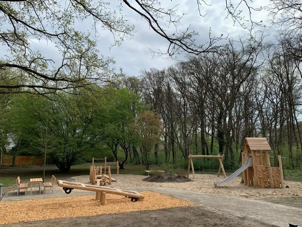 Der alte Platz war in die Jahre kommen und wurde in sieben Wochen neugestaltet. Die alten Spielgeräte wurden durch neue aus Robinienholz ersetzt. Neben einen Kletterturm mit Sandaufzügen und einer Rutsche, einer Doppelschaukel und Balancierbalken und einem Reck, gibt es für die ganz Kleinen eine Spielkombination. Eine breite Wippe mit Netzen ist ein integratives Spielangebot. Sitzgelegenheiten für laden zum Picknicken ein.