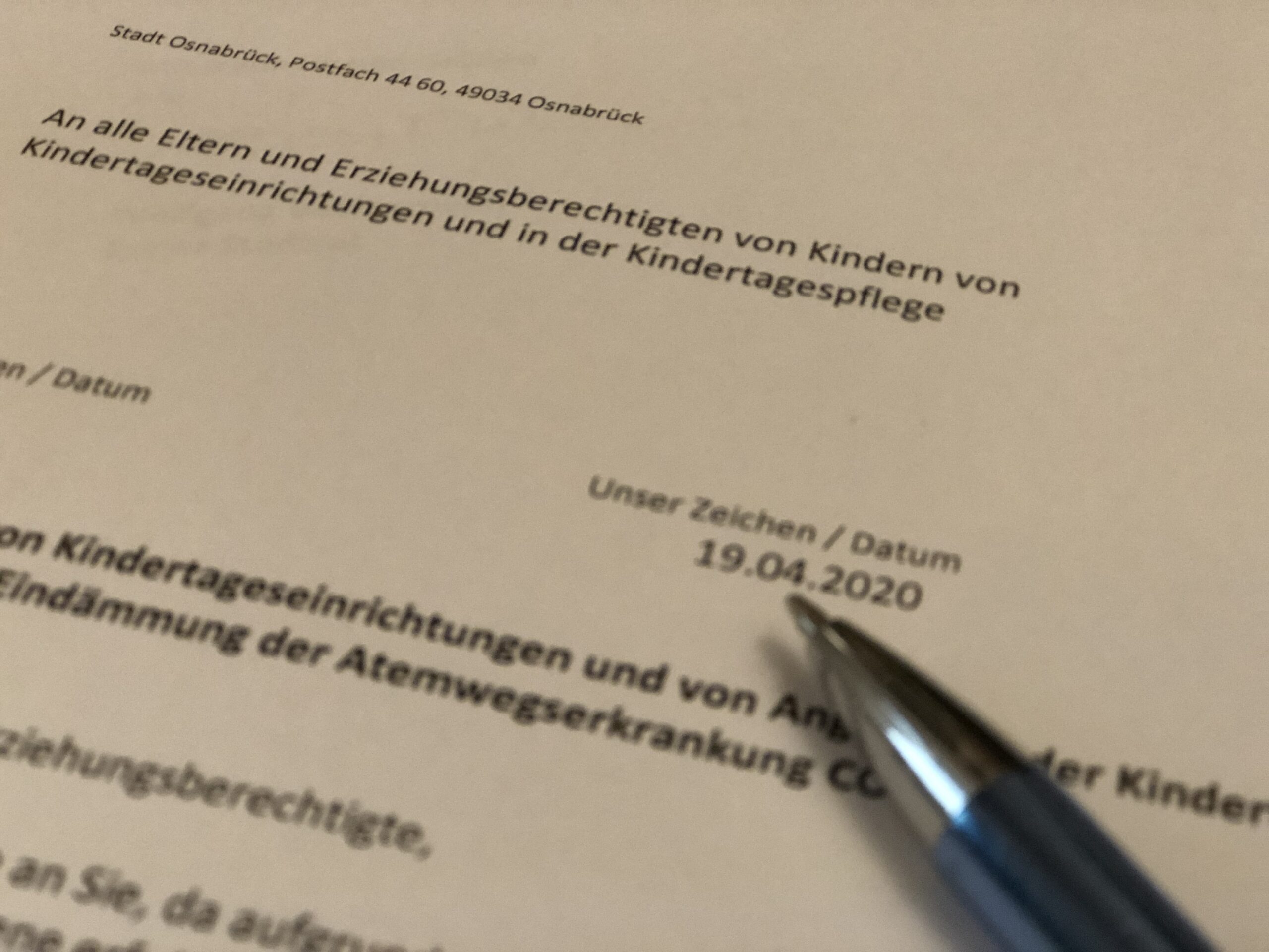 In einem weiteren Schreiben, das ebenfalls unserer Redaktion vorliegt und im Verlauf des Sonntags(!!) an alle Träger von Kindertageseinrichtungen in Osnabrück verschickt wurde, wird angekündigt, dass erst ab Dienstagabend auf der Homepage der Stadt Osnabrück oder in den jeweiligen Kindertagesstätten dazu Informationen vorliegen werden, wie dann ab Mttwoch, den 22.04.2020 die Notbetreuung ausgeweitet werden soll.