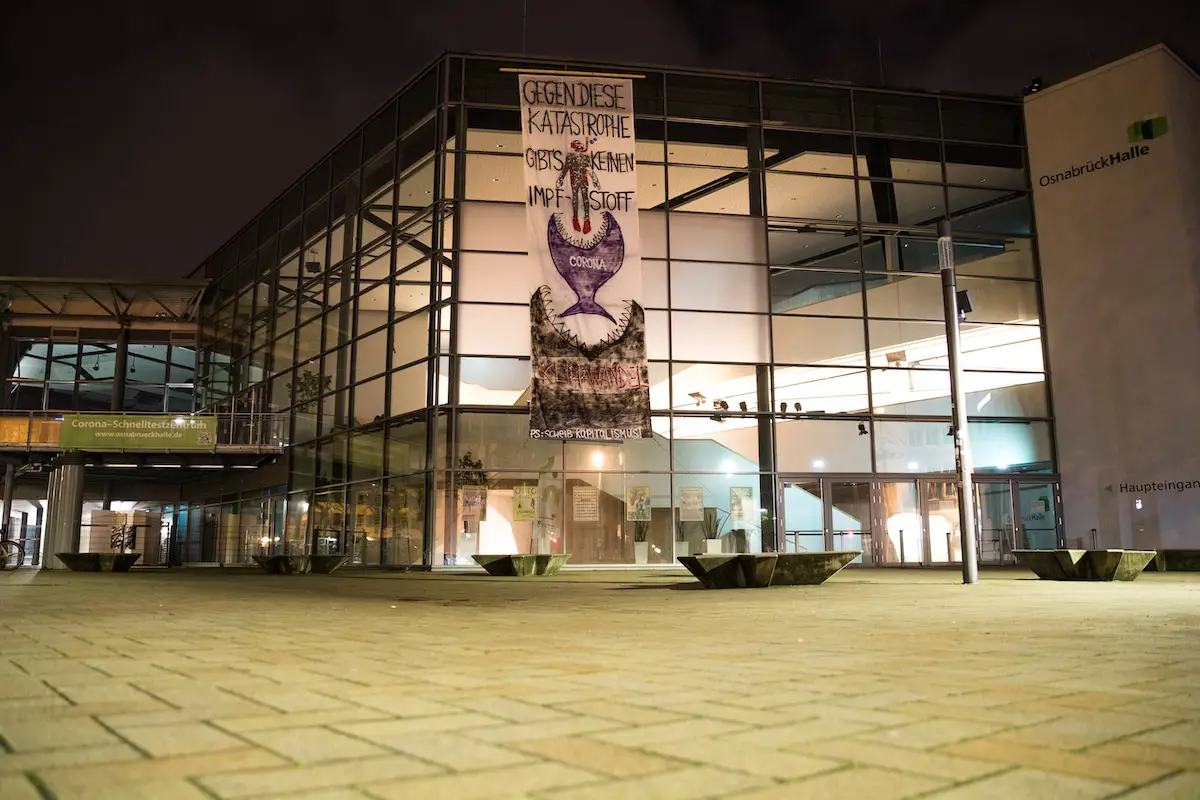 Am gestrigen Dienstag, den 15. Dezember 2020, wurde ein großes Banner mit der Aufschrift „Gegen diese Katastrophe gibt es keinen Impfstoff“ an der OsnabrückHalle befestigt. Der „Verein Freier Menschen“ aus Osnabrück bekennt sich zum „Bannerdrop“ und spielt mit dem Banner auf die weltweite Klimakrise an.