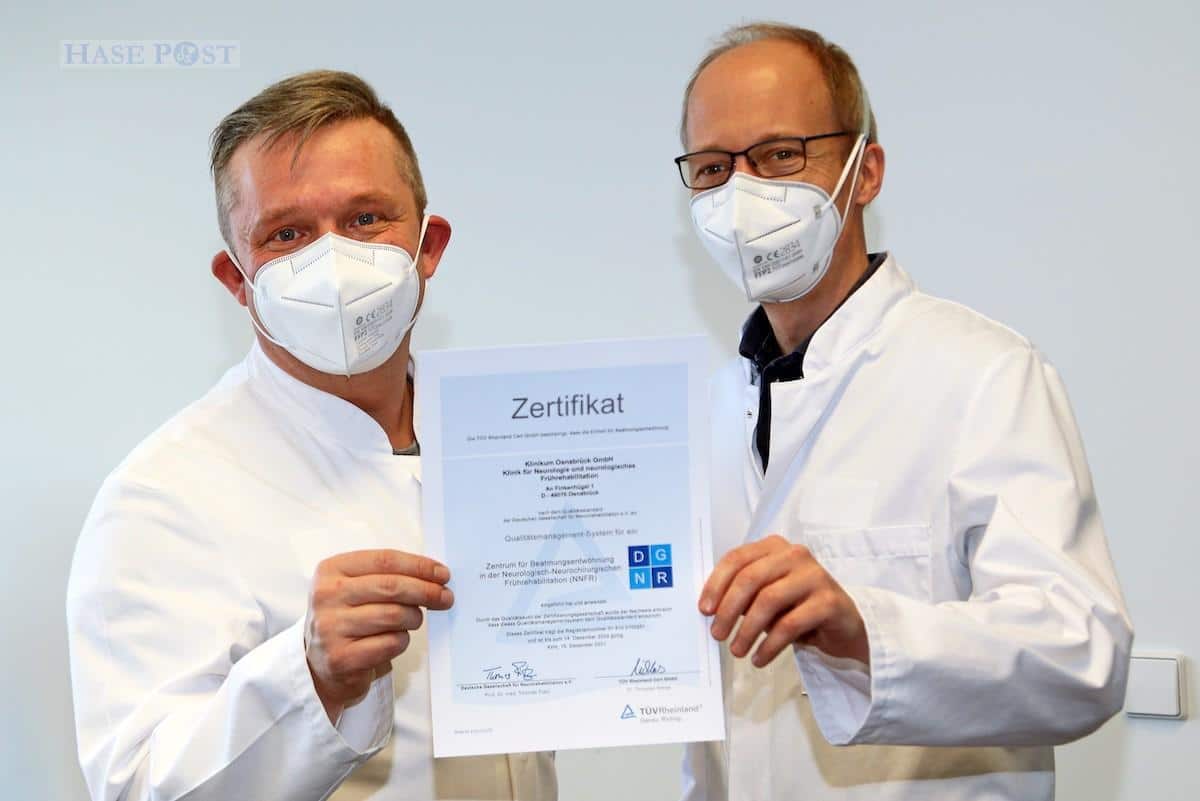 Frans Blok und Rudolf Küster, Geschäftsführer des Klinikums, sind sehr stolz auf das Weaning-Zentrum und erklären, dass das Zertifikat eine weitere Bestätigung der exzellenten neurologischen Versorgung im Klinikum Osnabrück sei.