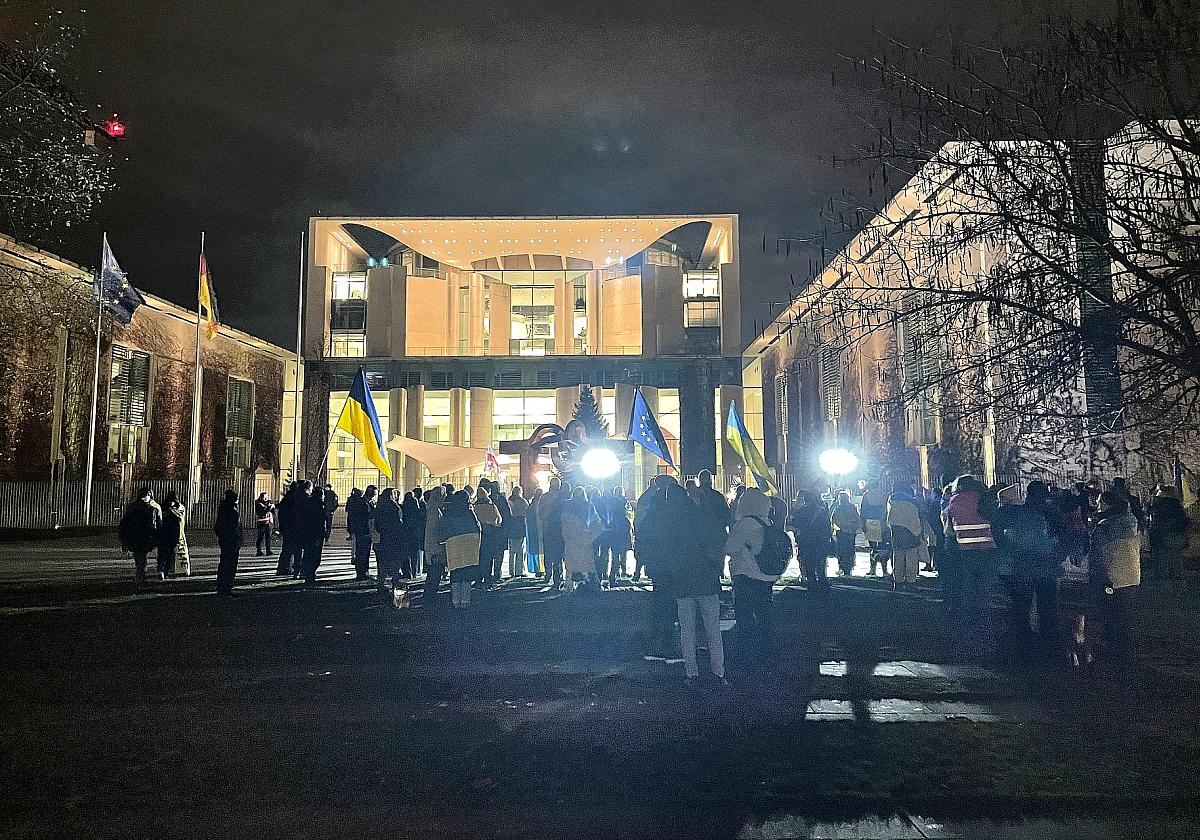 Der Ukrainekrieg dürfte trotz des 28-Punkte-Plans aus Washington wohl eine geringere Rolle bei den Gesprächen spielen. Vor dem Kanzleramt versammelte sich trotzdem eine Gruppe pro-ukrainischer Demonstranten.