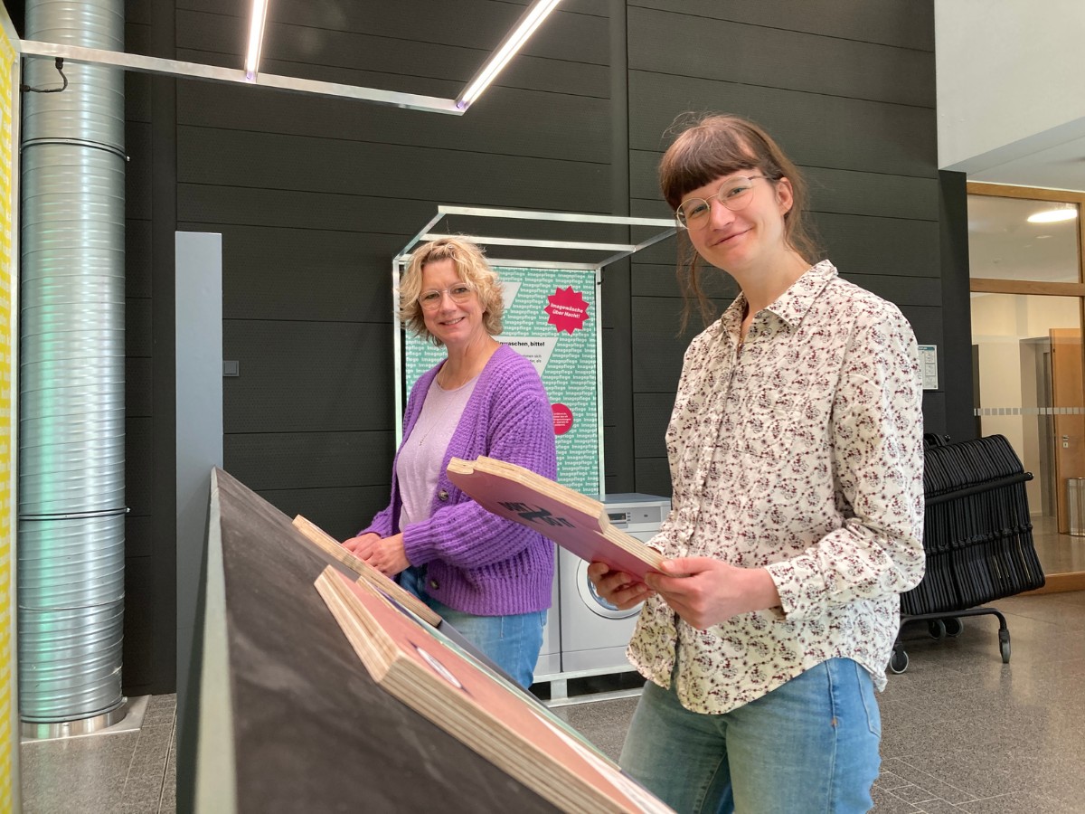 Wiebke Lenz (li.) und Kerstin Schulte (re.) von der DBU an einer interaktiven Station der neuen Ausstellung. / Foto: Dominik Lapp