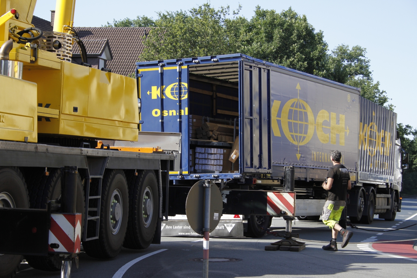 Gegen 15:45 Uhr fuhr der Fahrer eines sogenannten Gliederzuges (LKW mit Anhänger) auf der Bremer Straße stadteinwärts und hielt an der Ampelkreuzung zum Hunteburger Weg. Beim Grünzeichen fuhr er an und bog nach rechts ab, wobei der Anhänger seines LKW umkippte.