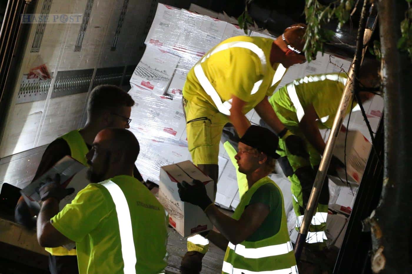 Deshalb musste von Mittwochabend bis zum frühen Donnerstagmorgen die Strecke zwischen Bramsche und Neuenkirchen-Vörden bereits ein erstes Mal voll gesperrt werden. Ein Bergungsteam musste die geladenen Weinflaschen in Kartons aus dem Auflieger holen, auf Paletten umpacken und in einen Ersatz-LKW verladen. Händisch bewegten zahlreiche Helfer so mehr als 15 der insgesamt 23 Tonnen Ladung. Die aktuelle Hitzeperiode sorgte auch nachts für hohe Temperaturen, die eine zusätzliche körperliche Belastung darstellten. Ein Bautrupp erneuerte währenddessen ein größeres Schild, welches der LKW überfahren hatte.