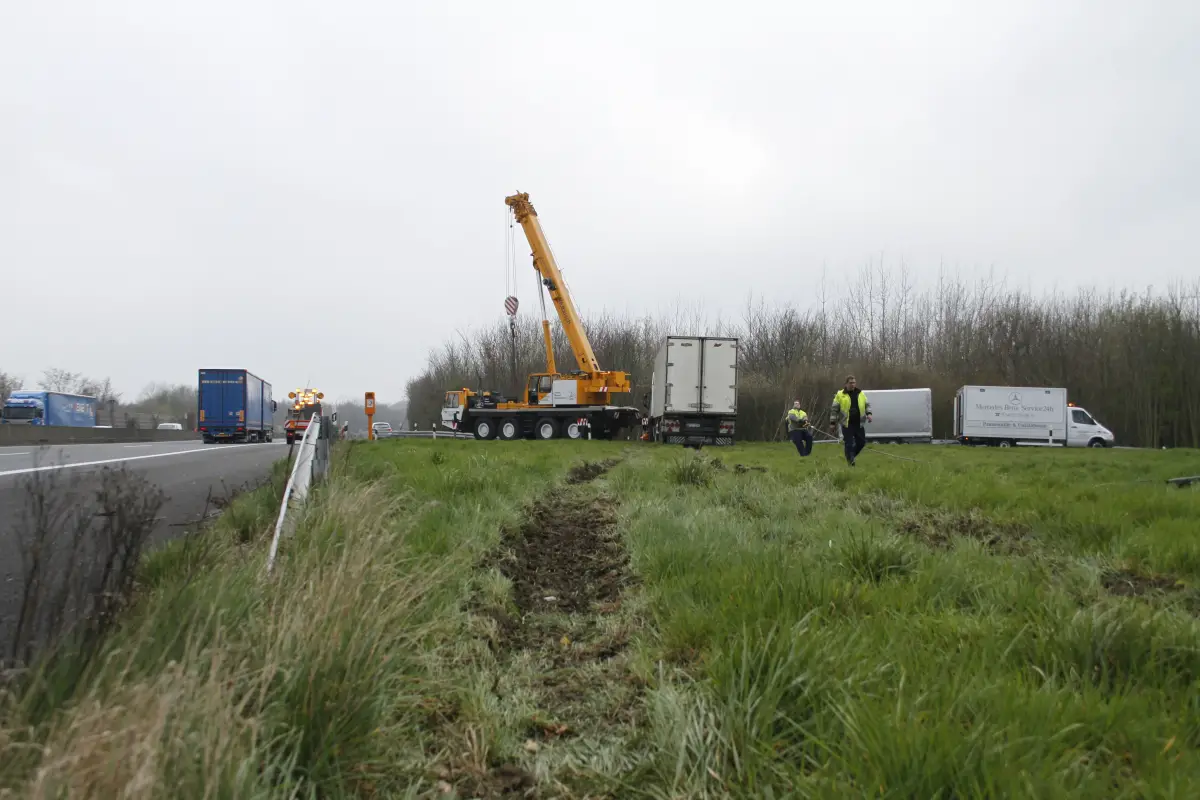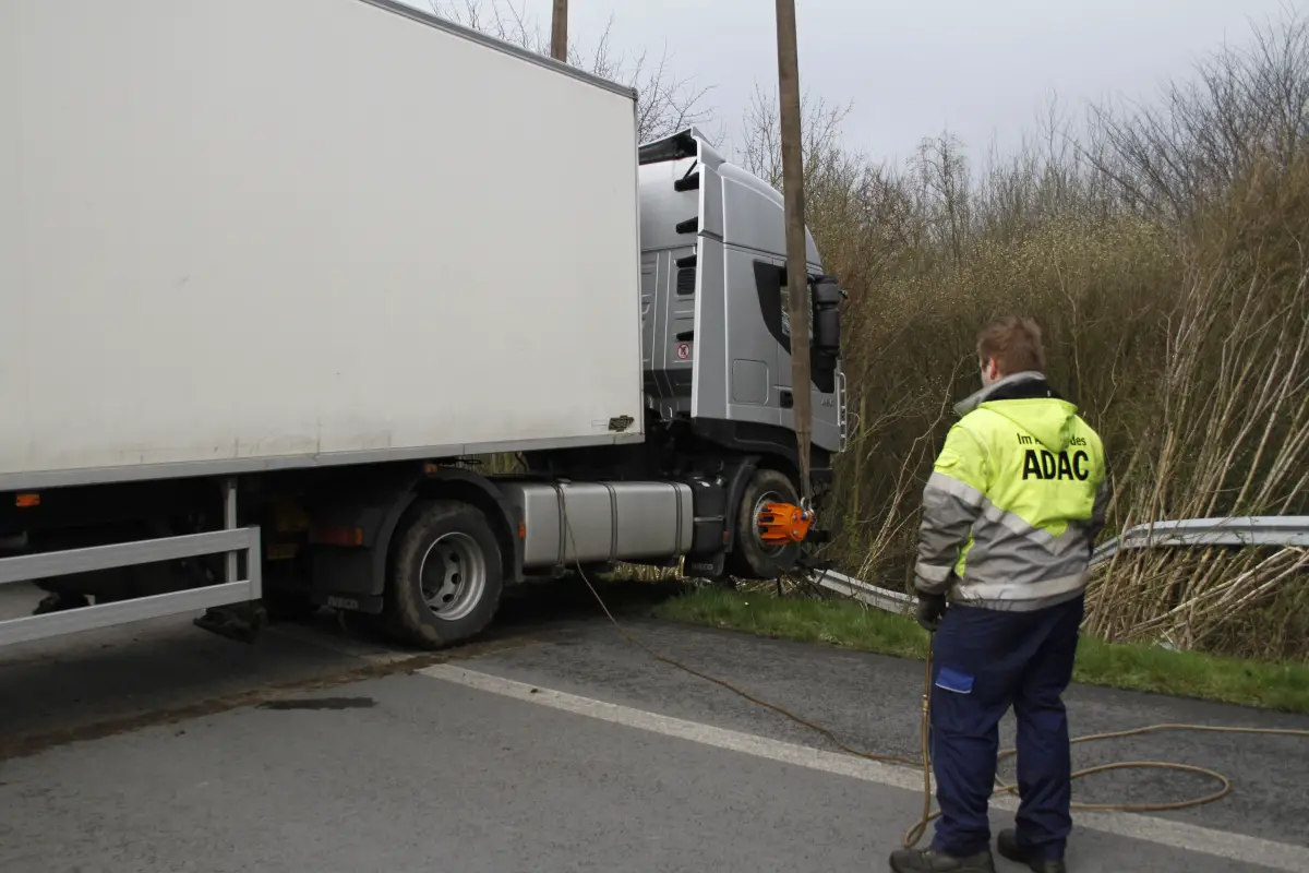 Der Unfall ereignete sich kurz nach 7 Uhr. Nach Angaben der Polizei war der LKW alleinbeteiligt, warum genau er von der Fahrbahn abkam, ist jedoch noch unklar. Nach der Unfallaufnahme rückte am Vormittag ein Bergungsunternehmen an. Mit einem Kran wurde der LKW zunächst gegen weiteres Abrutschen gesichert. Während ein Abschlepp-LKW mit einer Winde den verunfallten Sattelzug am Heck zurück zog, schwenkte zeitgleich der Kran die Zugmaschine aus dem Wäldchen heraus.